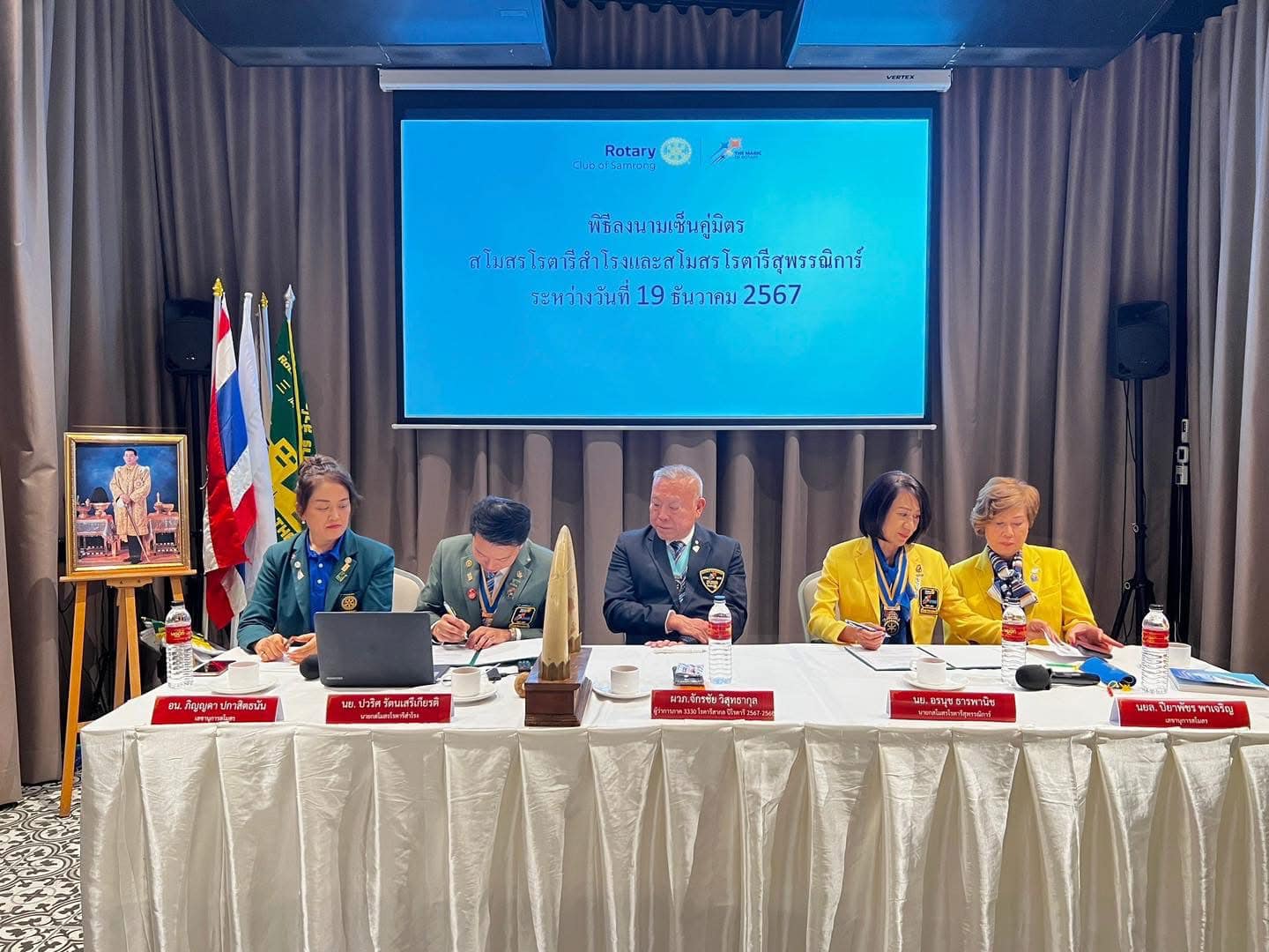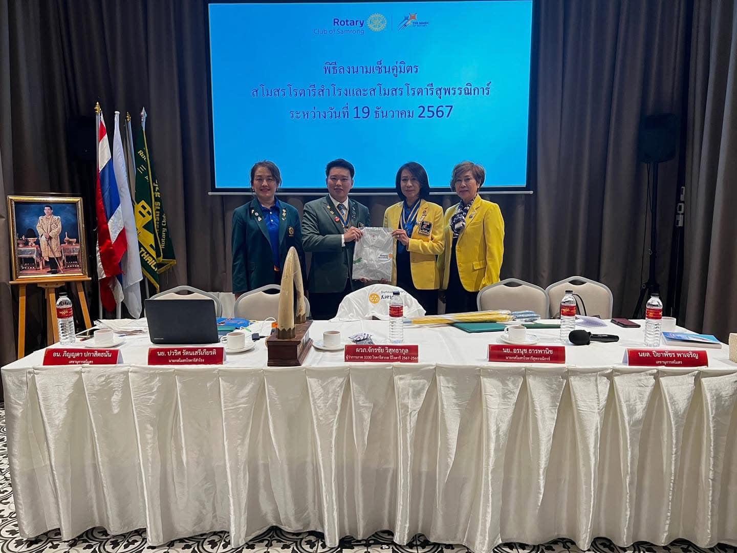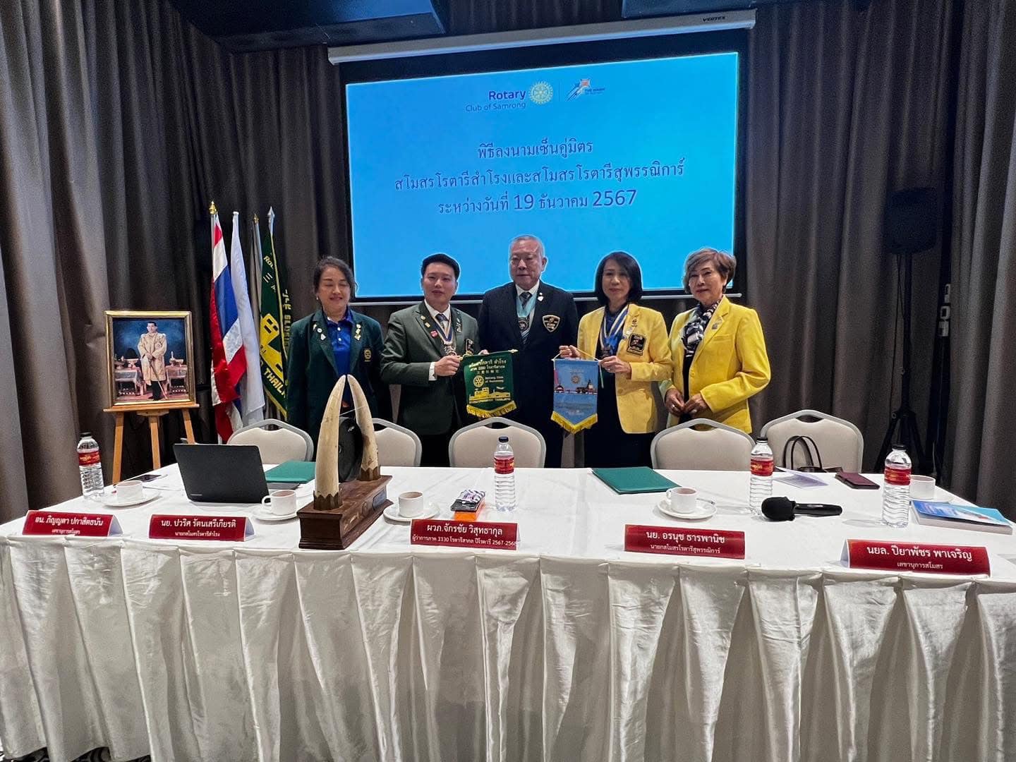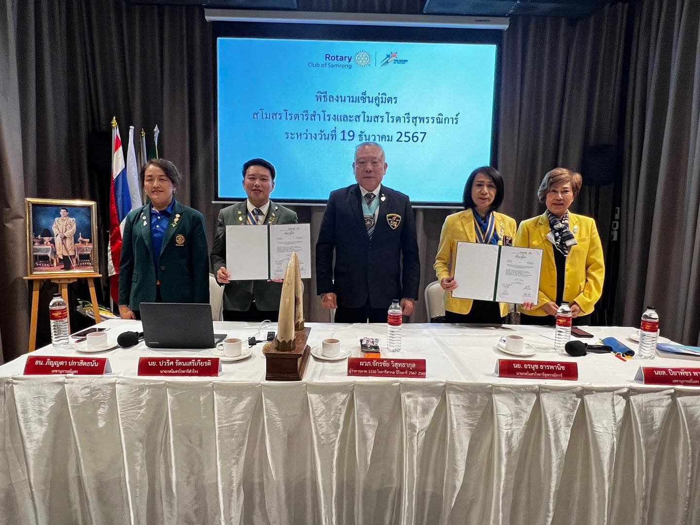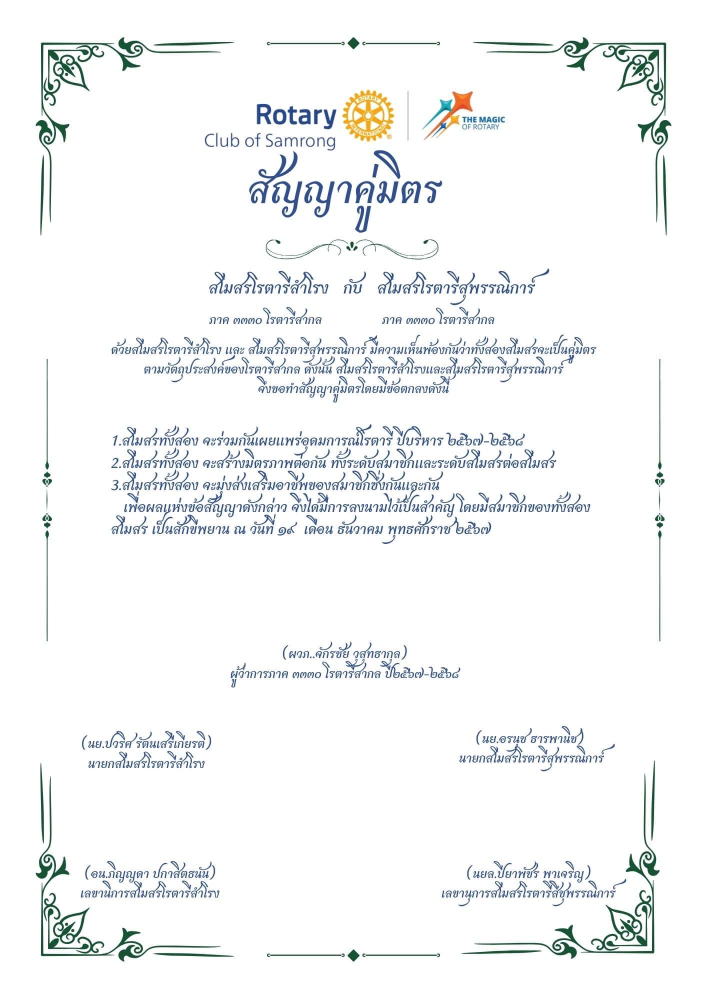 ช่วงที่สาม ร่วมพิธีลงนามคู่มิตรระหว่างสโมสรโรตารีสำโรงและสโมสรโรตารีสุพรรณิการ์ และร่วมประชุมนายกและกรรมการบริหารสโมสรฯ เพื่อรับฟังข้อมูลต่างๆ ของสโมสรฯ พร้อมให้คำชี้แนะ ในการนำไปปรับใช้ให้บรรลุตามวัตถุประสงค์ของประธานโรตารีสากล ปีโรตารี 2567-2568 ซึ่งมี ผชภ.ดร.อัมพรรณ์ กล้าหาญ ผู้ช่วยผู้ว่าการภาค 3330 พื้นที่ 22 ปีโรตารี 2567-2568 และ นย.ปวริศ รัตนเสรีเกียรติ นายกสโมสรโรตารีสำโรง พื้นที่ 22 ปีโรตารี 2567-2568 พร้อมสมาชิกสโมสรฯ คณะครู นักเรียนให้การต้อนรับ ณ ห้องประชุมโรงเรียนคลองกระทุ่มราษฎร์อุทิศ