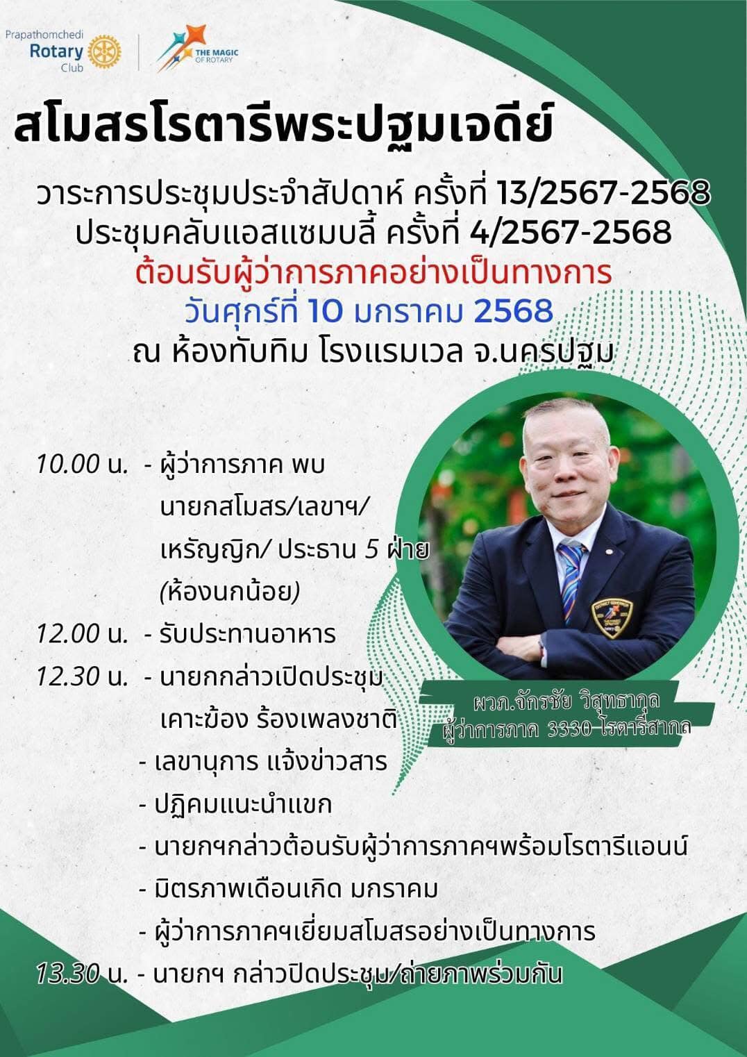 ช่วงที่สอง เวลา 09:00-13:30น.พบประธานคณะกรรมการบริหารสโมสร 5 ฝ่าย เพื่อรับฟังข้อมูลต่างๆ ของสโมสรฯ พร้อมให้คำชี้แนะ และนำไปปรับใช้ให้บรรลุตามวัตถุประสงค์ของประธานโรตารีสากล ปีโรตารี 2567-2568 ซึ่งมี ผชภ.ทวีโชค โกสมนึก ผู้ช่วยผู้ว่าการภาค 3330 พื้นที่ 25 ปีโรตารี 2567-2568 และ นย.ศศิวิมล แก้วทวีทรัพย์ นายกสโมสรโรตารีพระปฐมเจดีย์ ภาค 3330 พื้นที่ 25 ปีโรตารี 2567-2568 ต่อด้วยประชุม Club assembly และประจำสัปดาห์ร่วมกับสมาชิกสโมสรฯ ณ ห้องประชุมทับทิม โรงแรมเวล จังหวัดนครปฐม
