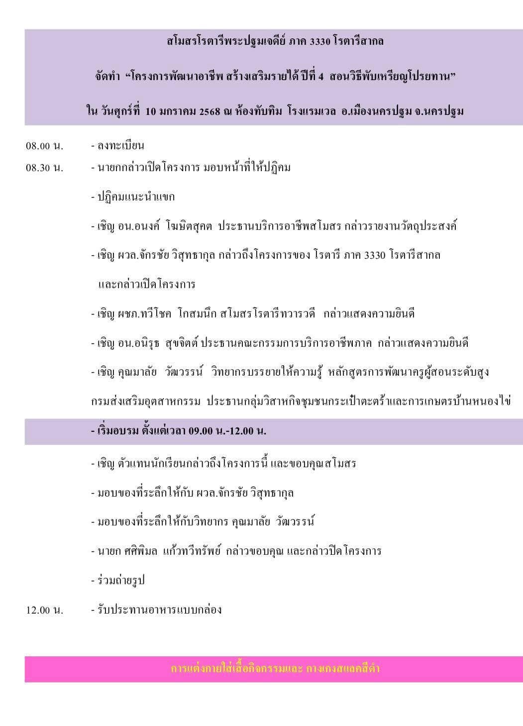 โดยช่วงแรก เวลา 08:00-09:00 น. เปิดงาน “โครงการพัฒนาอาชีพ สร้างเสริมรายได้ ปีที่ 4 สอนวิธีพับเหรียญโปรยทาน" ณ ห้องทับทิม โรงแรมเวล อ.เมืองนครปฐม จ.นครปฐม และกลับมากล่าวปิดโครงการ เวลา 11.30 น.