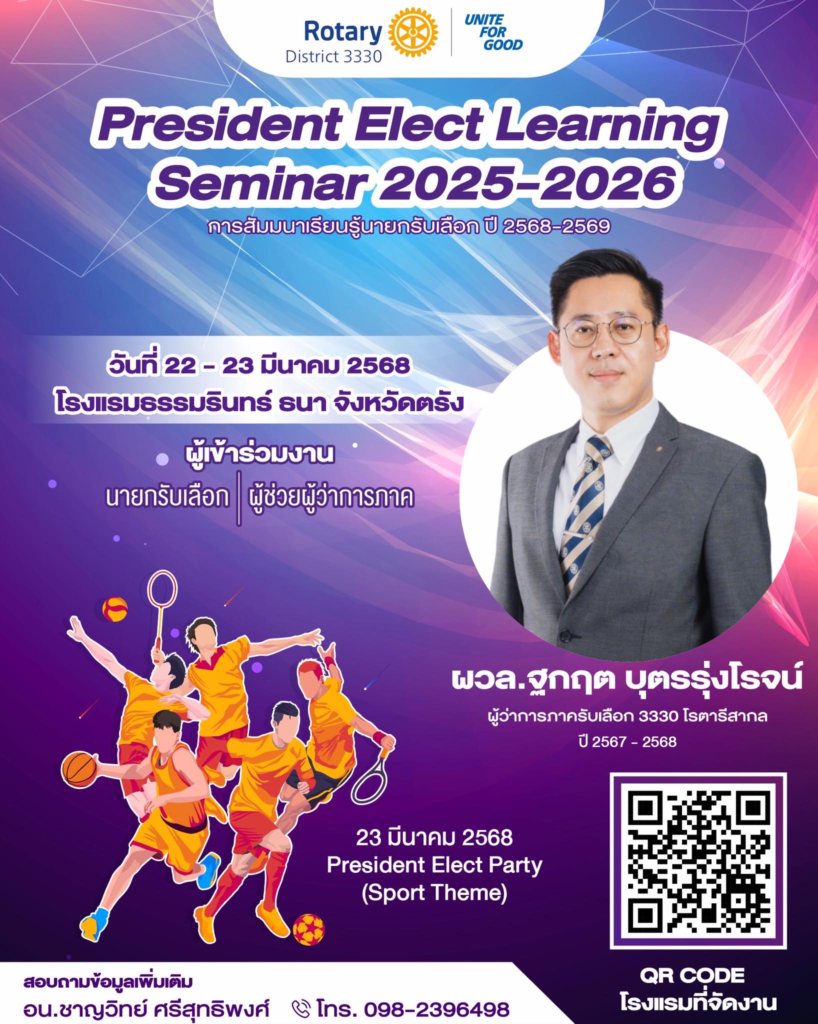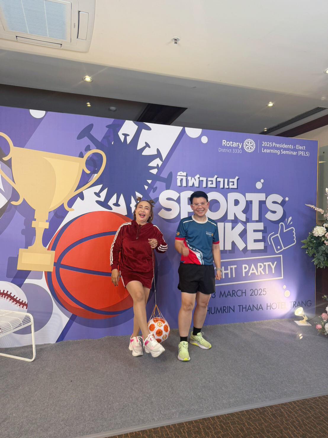 วันที่ 22-23 มีนาคม 2568 ผวล.ฐกฤต บุตรรุ่งโรจน์ ผู้ว่าการภาครับเลือก 3330 โรตารีสากล ปีโรตารี 2568-2569 จัดงาน Night Party 2025 ตรีม กีฬาฮาเฮ Sports Like หลังจากสัมมนาเรียนรู้นายกรับเลือก ประจำปี 2568-2569 (2025 Presidents-Elect Learning Seminar (PELS) ณ โรงแรม ธรรมรินทร์ ธนา จังหวัดตรัง