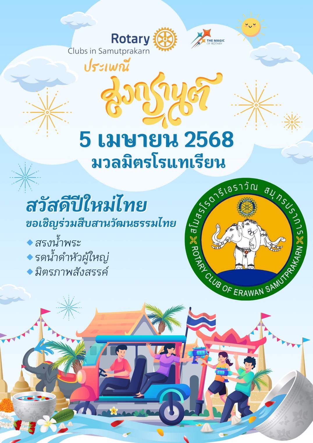 วันเสาร์ที่ 5 เมษายน 2568 เวลา 17:00-20:30 น. ผวภ.จักรชัย วิสุทธากุล ผู้ว่าการภาค 3330 โรตารีสากล ปีโรตารี 2567-2568 และโรตารีแอนน์ พรจิต ยิ้มภากร ร่วมงานสงกรานต์ 10 สโมสรโรตารีในพื้นที่สมุทรปราการ เพื่อสืบสานประเพณีไทย จัดโดยสโมสรโรตารีเอราวัณเป็นเจ้าภาพ ณ ภัตตาคารสุกี้เรือนเพชร 2 ถนนศรีนครินทร์ จังหวัดสมุทรปราการ
