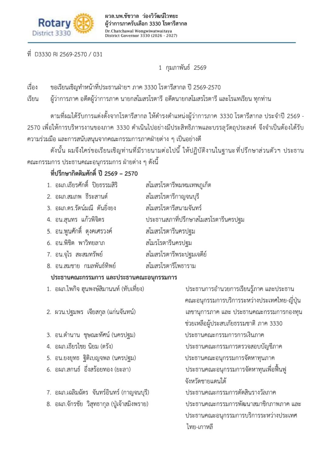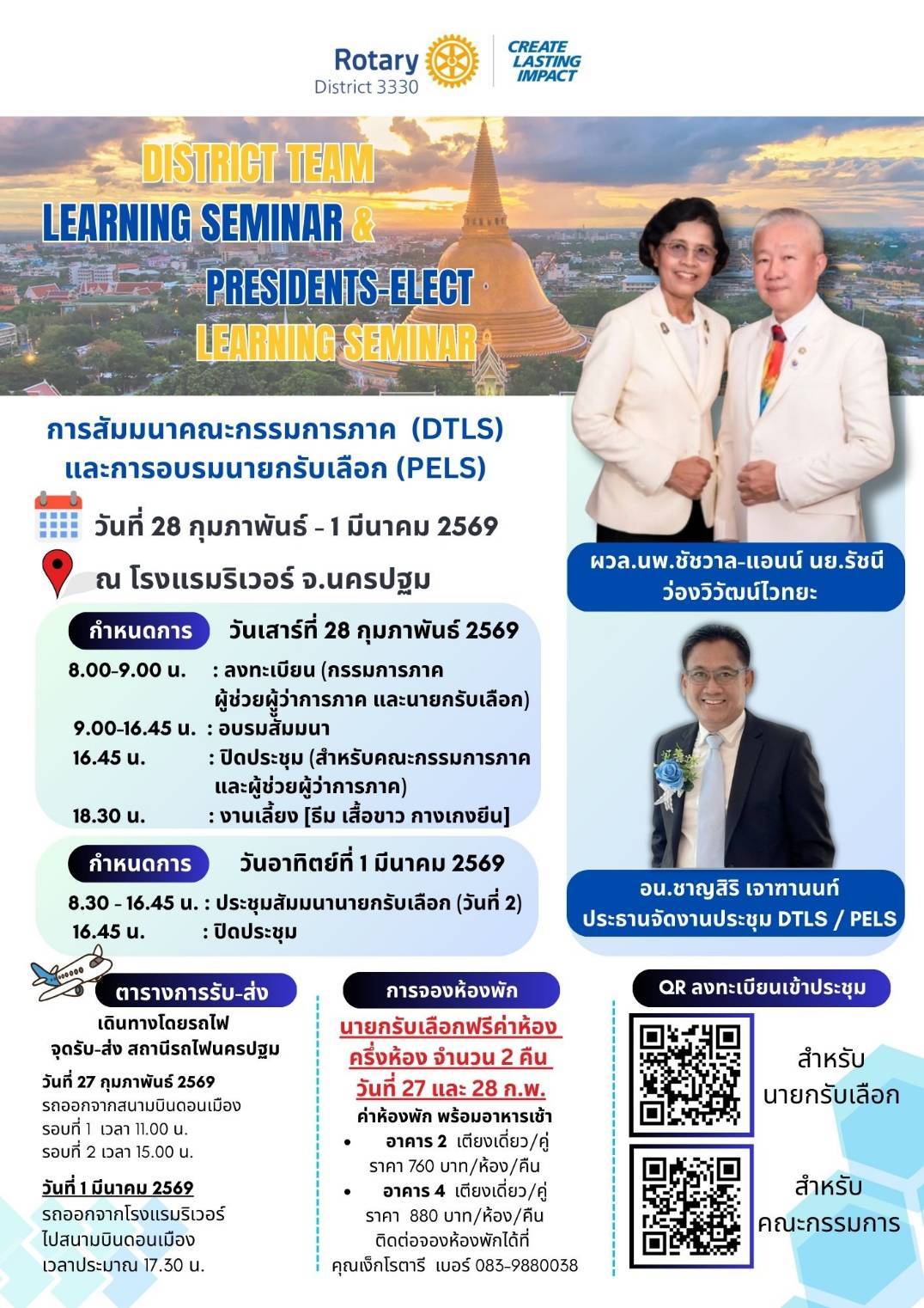 การสัมมนาคณะกรรมการภาค (DTLS) และการอบรมนายกรับเลือก (PELS) วันที่ 28 กุมภาพันธ์ - 1 มีนาคม 2569 ณ โรงแรมริเวอร์ จ.นครปฐม