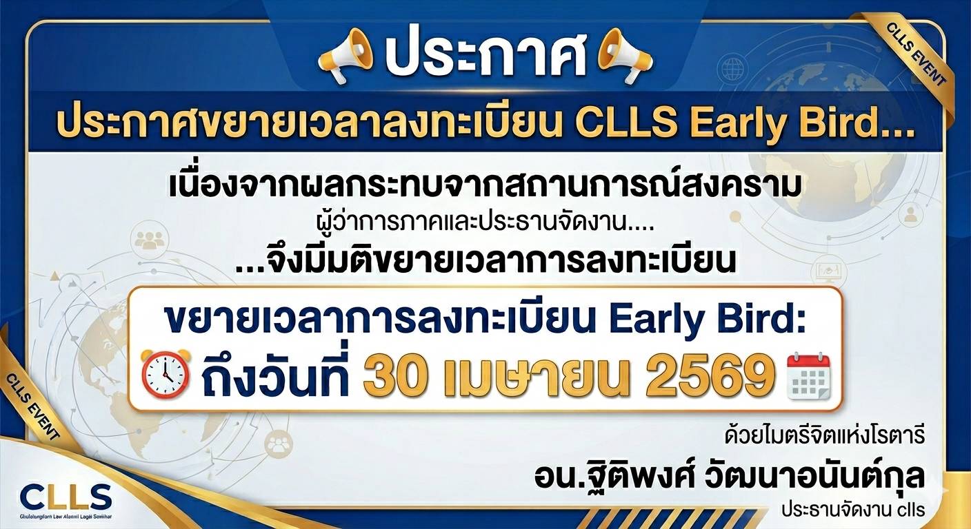 ประกาศขยายเวลาลงทะเบียน CLLS Early Bird.. เนื่องจากผลกระทบจากสถานการณ์สงคราม ผู้ว่าการภาคและประธานจัดงาน..... ...จึงมีมติขยายเวลาการลงทะเบียน ขยายเวลาการลงทะเบียน Early Bird: ถึงวันที่ 30 เมษายน 2569