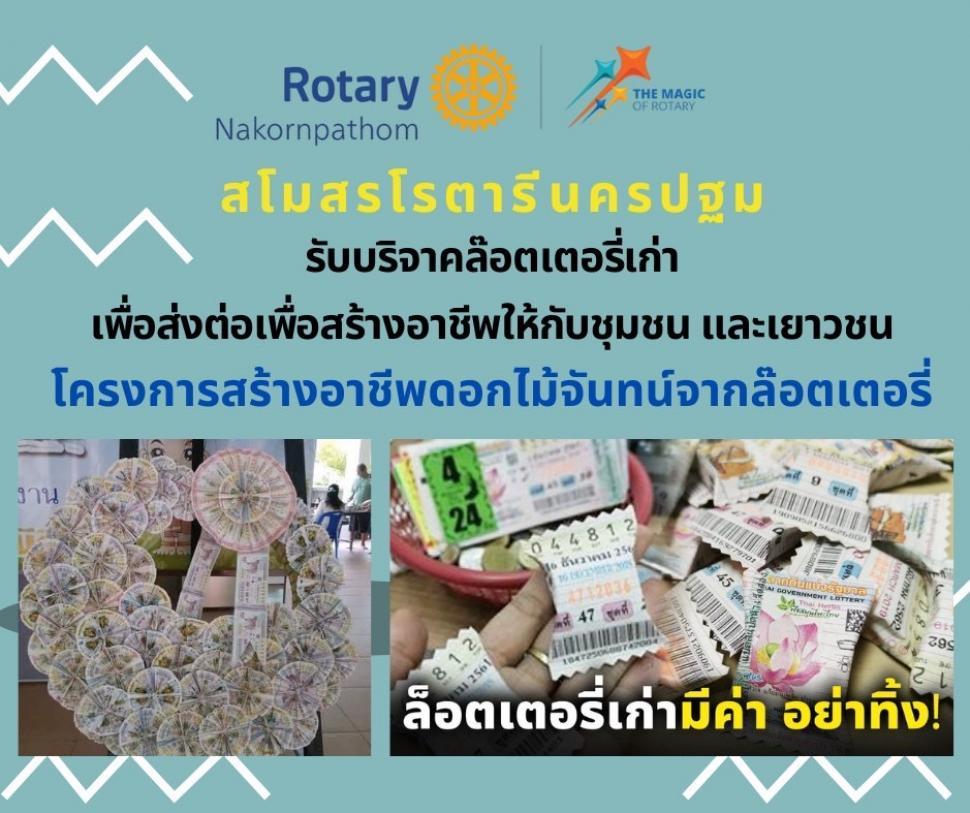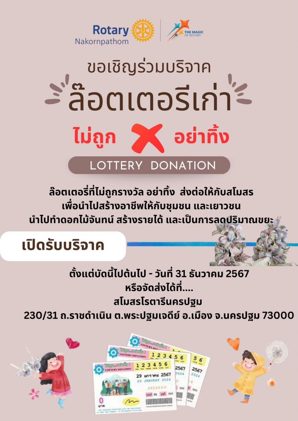 สโมสรโรตารีนครปฐม ขอเชิญร่วมบริจาค ล๊อตเตอรีเก่า ไม่ถูก อย่าทิ้ง ล๊อตเตอรี่ที่ไม่ถูกรางวัล อย่าทิ้ง ส่งต่อให้กับสโมสร (View:1605)