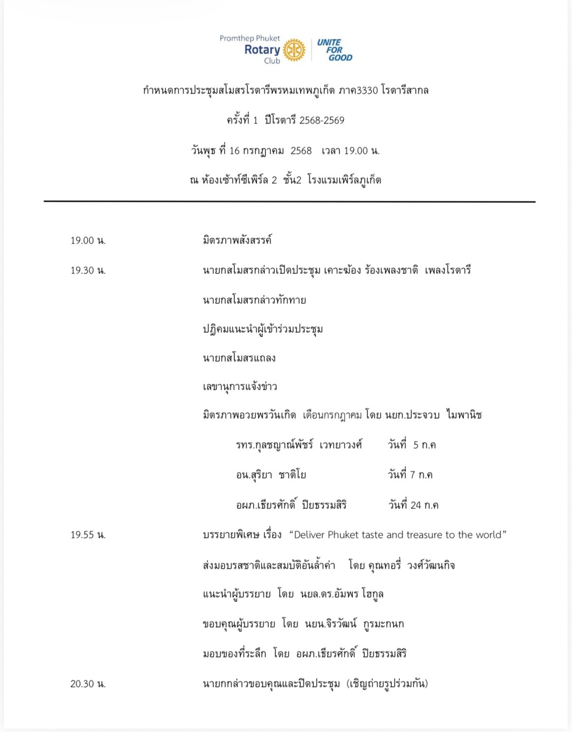 ประชุมสโมสรโรตารีพรหมเทพภูเก็ต ครั้งที่ 1 ปีโรตารี 2568-2569