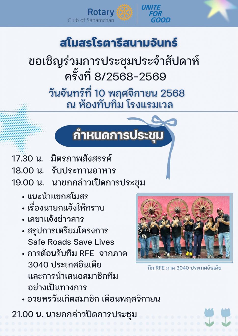 วันที่ 10 พฤศจิกายน 2568 สโมสรโรตารีสนามจันทร์ ประชุมปกติประจำสัปดาห์ ครั้งที่ 8/2568-2569 นำโดย นย.สุกิจ นิยมทรัพย์ พร้อมด้วยคณะกรรมการ สมาชิกและแอนน์ สรุปการเตรียมโครงการ Save Roads Save Lives โดย อน.วิธิวัสส์, ต้อนรับทีม Rotary Friendship Exchange จากภาค 3040 ประเทศอินเดีย การนำเสนอสมาชิกทีมอย่างเป็นทางการ และการนำเสนอผลงานโครงการ, และอวยพรวันเกิดสมาชิกที่เกิดในเดือนพฤศจิกายน