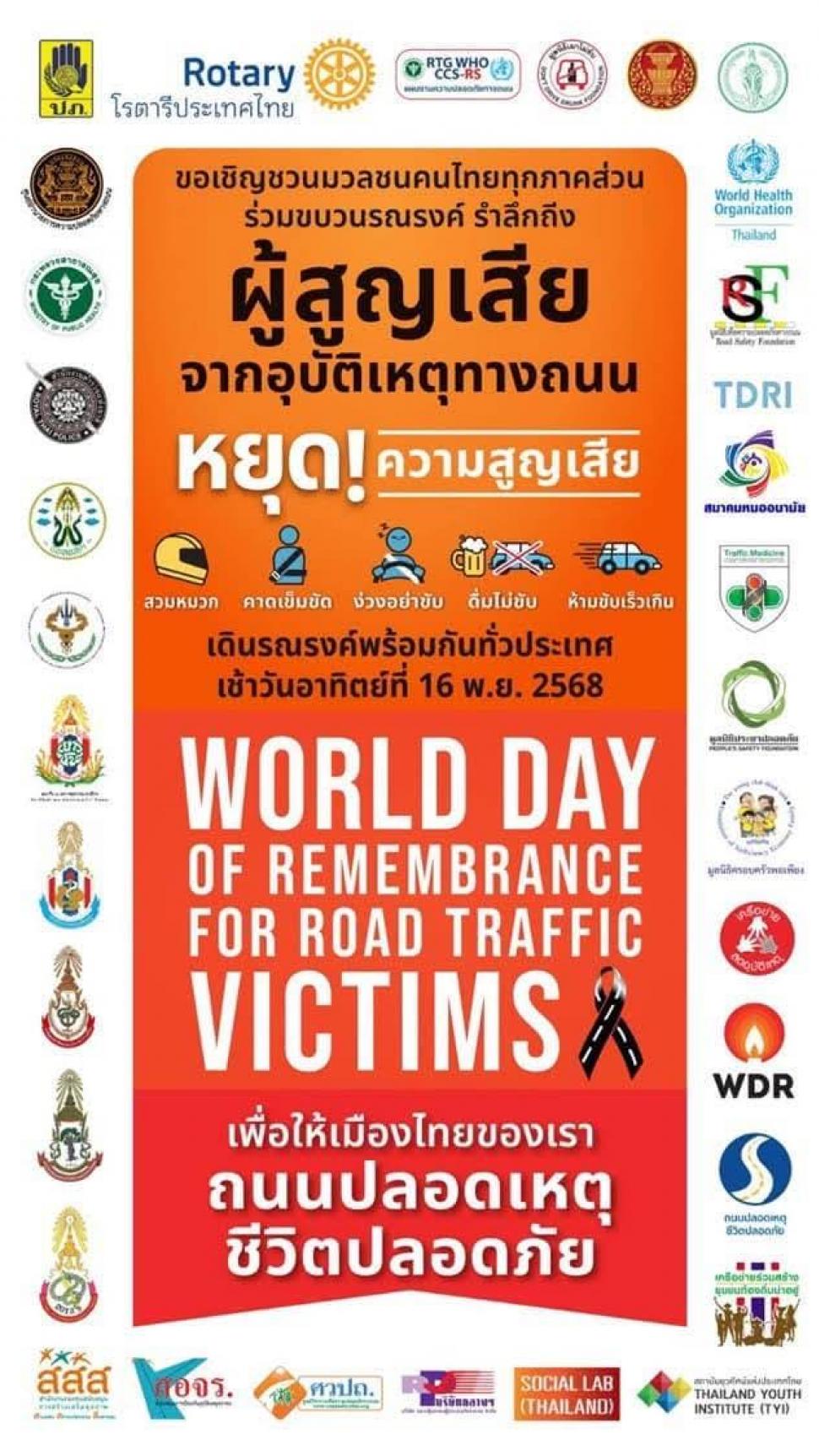 ถนนปลอดเหตุ ชีวิตปลอดภัย วันเดินรณรงค์และกิจกรรมไว้อาลัย วันที่ พ.ย,2568,สโมสรโรตารี 9 สโมสรในจังหวัดสงขลา ,สโมสรโรตารีสตูล& สโมสรโรตารีพัทลุงได้จัดกิจกรรมต่างๆมีหน่วยงานภาครัฐ ภาคเอกชนเข้าร่วมกิจกรรม (View:269)