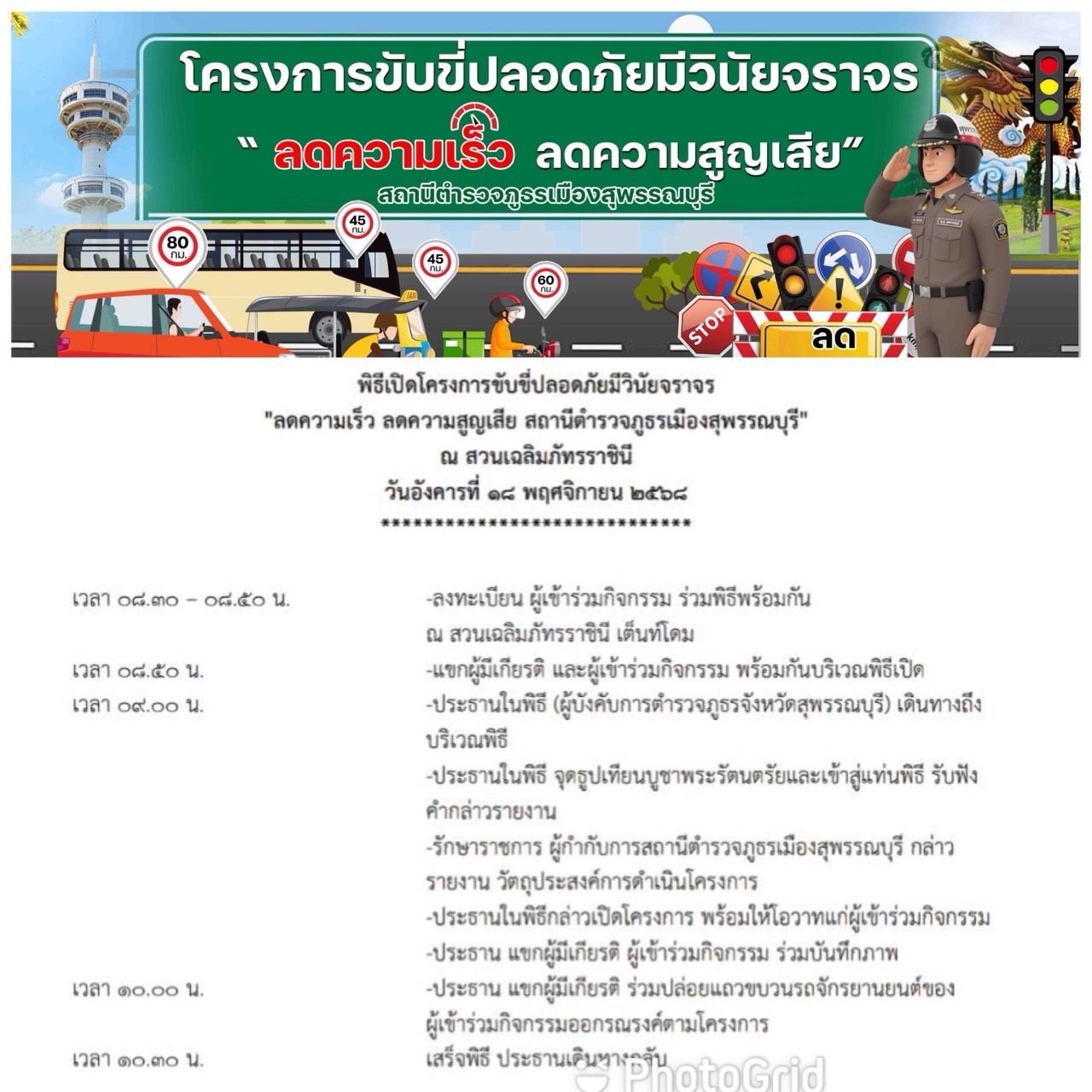 ร่วมพิธีเปิดโครงการ ขับขี่ปลอดภัยมีวินัยจราจร โดย สถานีตำรวจภูธรเมืองสุพรรณบุรี ณ สวนเฉลิมภัทราราชินี โดยทั้ง 6 สโมสรร่วมบริจาคเงินสโมสรละ 2,000 บาทรวม12,000 บาทเพื่อจัดซื้ออาหารเครื่องดืมให้บริการผู้มาร่วมกิจกรรมครั้งนี้ สวนรายละเอียดเพิ่มเติมอ่านได้จากเอกสารแนบที่แนบมาครับ