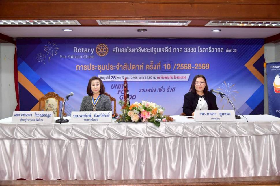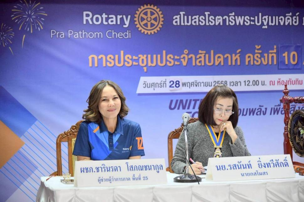28พย.68 สโมสรโรตารีพระปฐมเจดีย์ จัดประชุมประจำสัปดาห์ ครั้งที่ 10/2568 พร้อมทำคลับแอสแซมบลี้ ครั้งที่ 3 เพื่อเตรียมต้อนรับผู้ว่าการภาคเยี่ยมอย่างเป็นทางการในวันศุกร์ที่ 12 ธันวาคม 2568 ประธาน 5 ฝ่ายฯ ชี้แจงกิจกรรมและโครงการต่าง ๆ โดยมี ผชภ.ชารินรดา โสภณชนากูล ผู้ช่วยผู้ว่าการภาค พื้นที่ 25 ร่วมให้คำปรึกษา ปฏิคมกล่าวขอบคุณสมาชิกที่นำอาหารมาให้รับประทาน -อน.ดร.จุไร สะสมทรัพย์และ อน.อนงค์ โฆษิตสุคต /สับปะรดภูแล -อน.เครือฟ้า นาเครือ / ขนมเทียนแก้ว -อน.ประเทือง หวลบุตตา / น้ำพริกหนุ่ม แค๊ปหมู ก่อนปิดการประชุมเป็นการจับรางวัลสมาชิกเข้าร่วมประชุม พร้อมนี้สโมสรโรตารีพระปฐมเจดีย์ ร่วมด้วย สมาคมสตรีนครปฐม จัดแพ็คสิ่งของเพื่อช่วยน้ำท่วมภาคใต้ ซึ่งจะได้ส่งมอบต่อไป