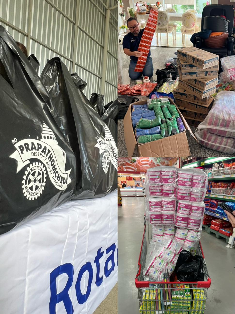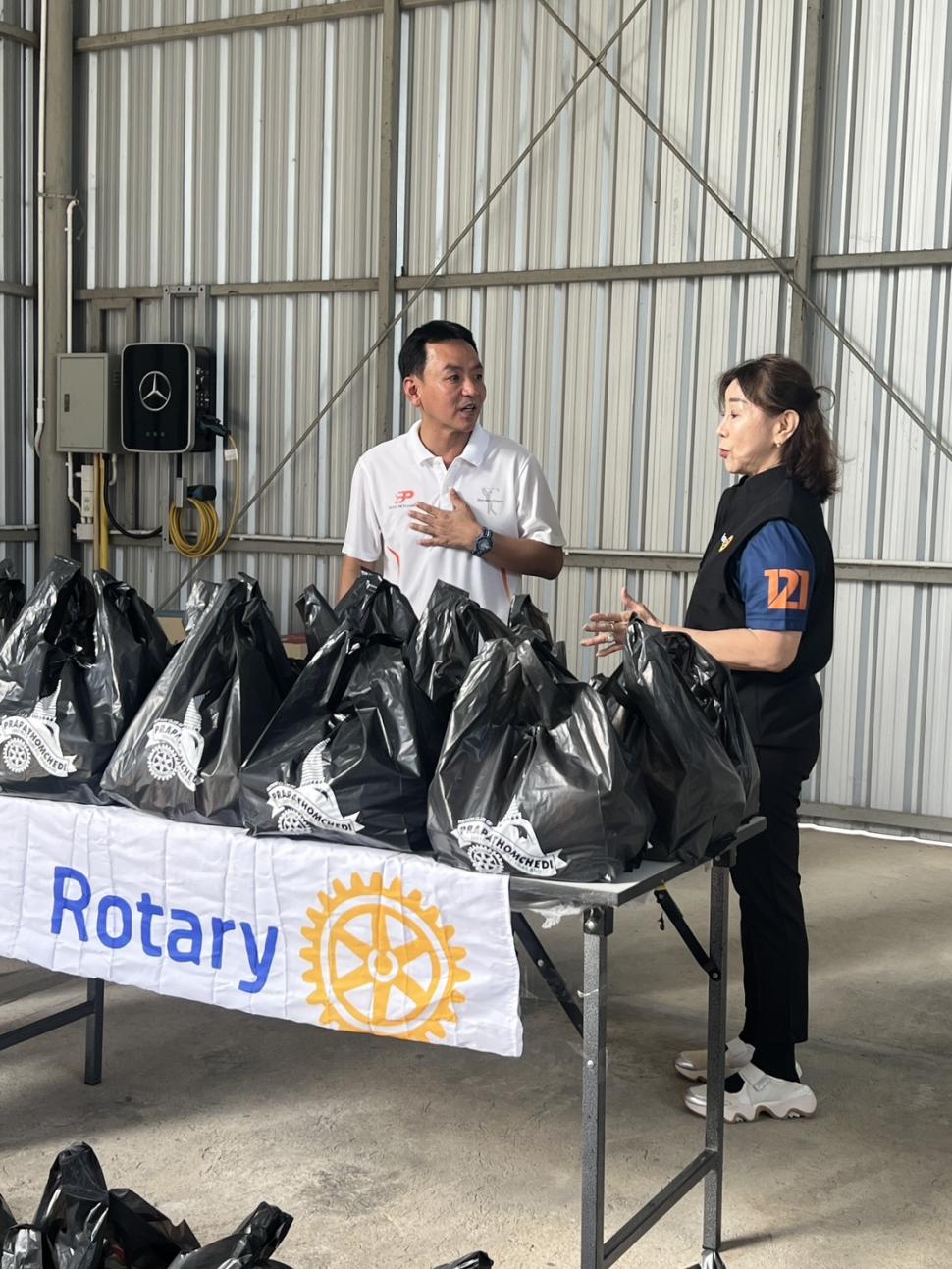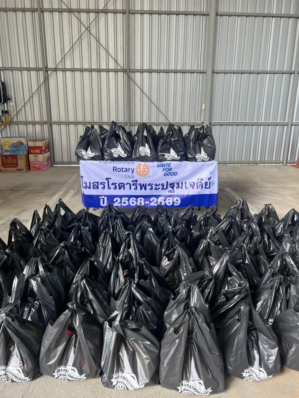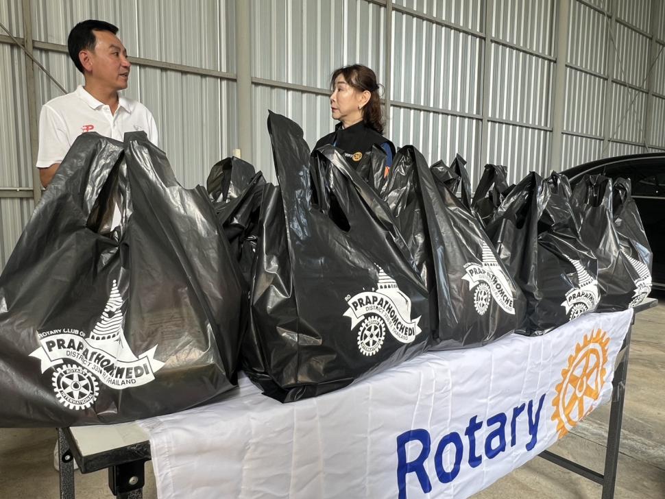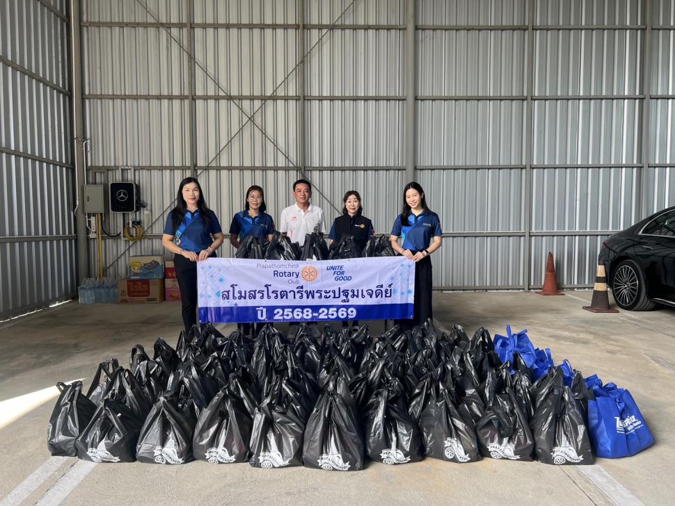 4 ธค.68 สโมสรโรตารีพระปฐมเจดีย์ โดย นย.รสนันท์ ยิ่งทวีศักดิ์ พร้อมด้วยสมาชิก นำถุงบรรจุผลิตภัณฑ์อุปโภค บริโภคต่าง ๆ มอบแต่ นย.พงษ์ พาวิทยาลาภ ประธานรุ่น 121 จำนวน 100 ชุด เพื่อมอบแก่ผู้ประสบอุทกภัยภาคใต้ ณ บริษัท เบนซ์เพชรรัตน์ จำกัด