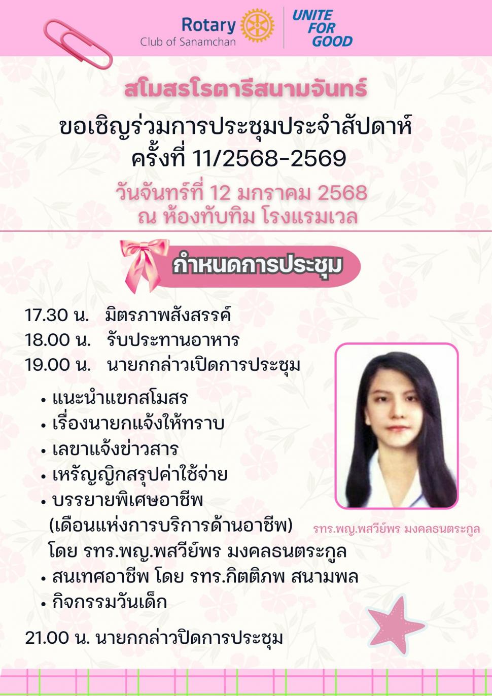 วันที่ 12 มกราคม 2569 สโมสรโรตารีสนามจันทร์ ประชุมปกติประจำสัปดาห์ ครั้งที่ 11/2568-2569 นำโดย นย.สุกิจ นิยมทรัพย์ พร้อมด้วยคณะกรรมการ สมาชิกและแอนน์ สรุปค่าใช้จ่าย โดย รทร.ณัฐกิตติ์ (เหรัญญิกสโมสร), บรรยายพิเศษอาชีพ เดือนแห่งการบริการด้านอาชีพ โดย รทร.พญ.พสวีร์พร, สนเทศอาชีพ โดย รทร.กิตติภพ, และรายละเอียดการประกวดสนเทศโรตารี โดย อน.สมเกียรติ