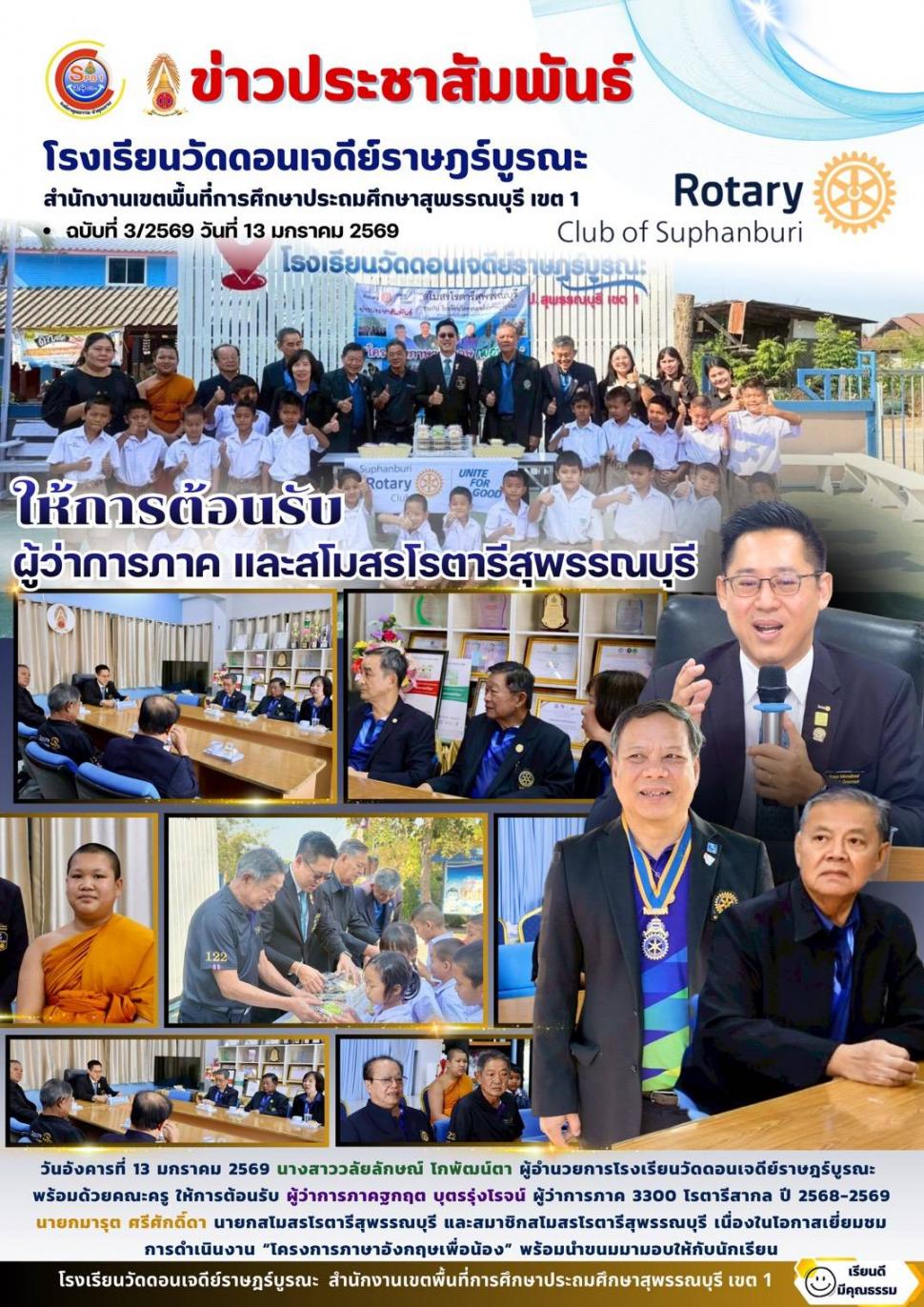 เวลา 9.00-10.00น.เชิญ ผวภ.ฐกฤต บุตรรุ่งโรจน์ เยี่ยมชมโครงการ ส่งเสริมการเรียนรู้ ภาษาอังกฤษเพื่อน้อง โรงเรียนวัดดอนเจดีย์ราษฎร์บูรณะ อ.เมือง จ.สุพรรณบุรี