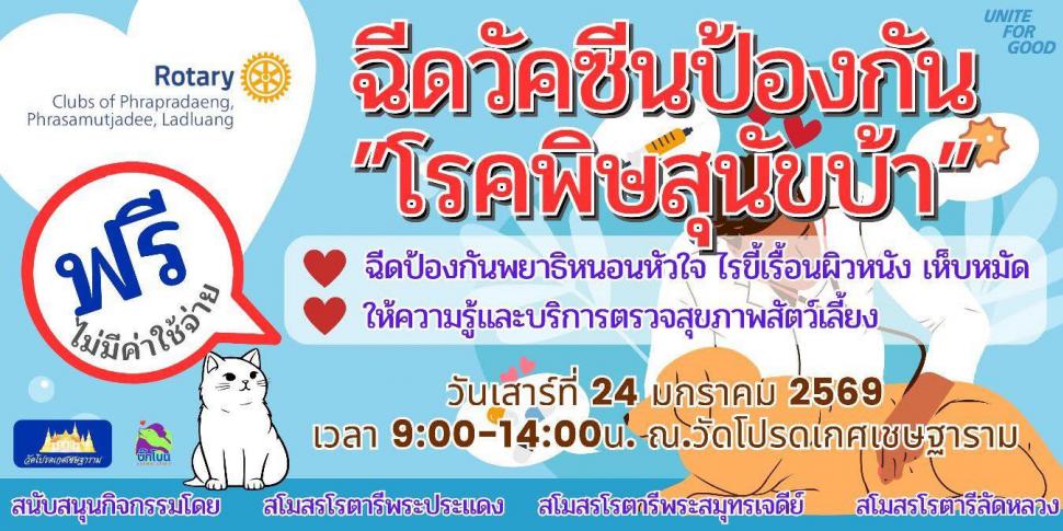 วันพฤหัสบดีที่ 24 มกราคม 2569 สโมสรโรตารีพระสมุทรเจดีย์, สโมสรโรตารีพระประแดง, สโมสรโรตารีลัดหลวง จัดกิจกรรม “ฉีดวัคซีนป้องกันโรคสุนัขบ้า”