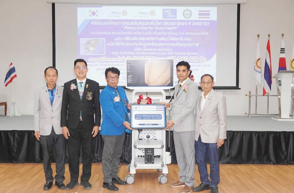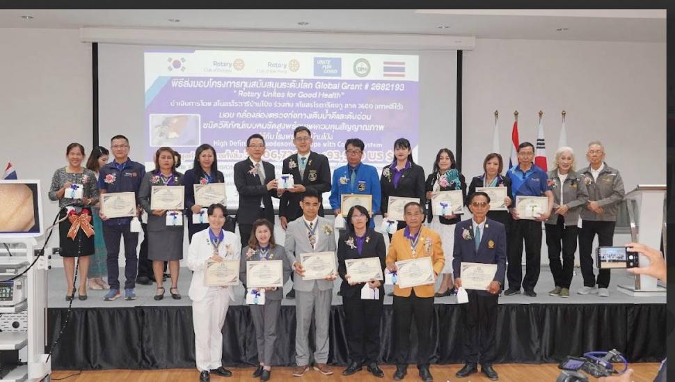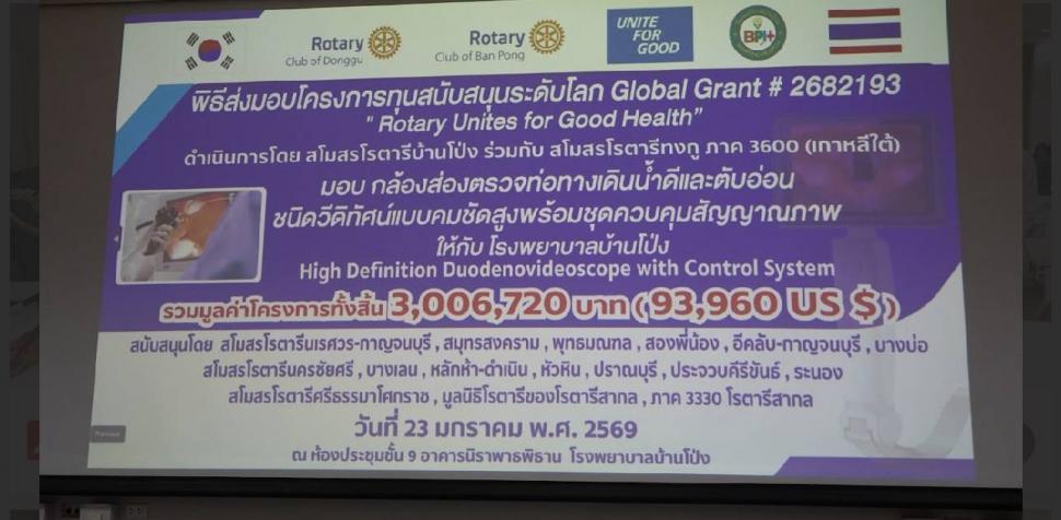 สโมสรโรตารีประจวบคีรีขันธ์ สร.หัวหิน สร.ปราณบุรี สร.อีคลับ กาญจนบุรี สร.นเรศวรกาญจนบุรี สร.สองพี่น้อง สร.สมุทรสงคราม สร.บางเลน สร.พุทธมณฑล สร.นครชัยศรี สร.บางบ่อ สร.ศรีธรรมโศกราช สร.ระนอง สร. หลักห้าดำเนินได้ทำพิธีมอบเครื่องมือแพทย์กล้องส่องผ่าตัดถุงน้ำดีพร้อมชุดจอภาพมูลค่า 3 ล้านบาทให้กับโรงพยาบาลบ้านโป่งเพื่อนำไปรักษาผู้ป่วยให้ได้มีความทันสมัยสะดวกและปลอดภัยมากขึ้น และขอขอบคุณท่านผู้ว่าการภาคฐกฤต บุตรรุ่งโรจน์ที่มาเป็นประธานมอบโครงการ Global Grant #2682193 ในครั้งนี้ด้วยครับ