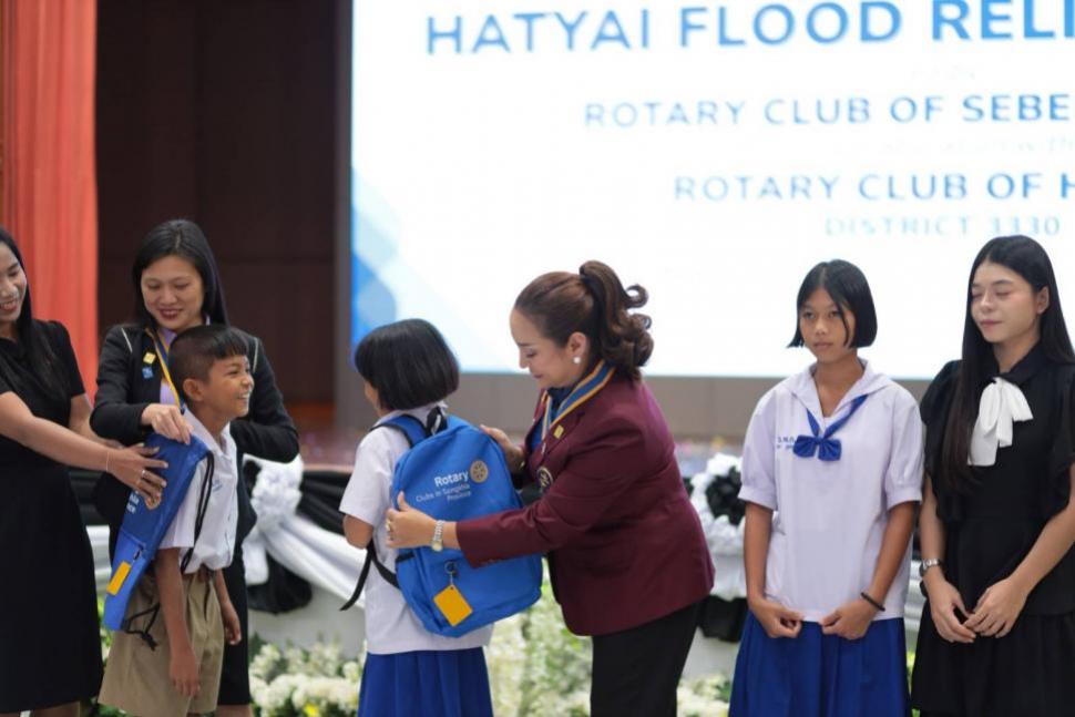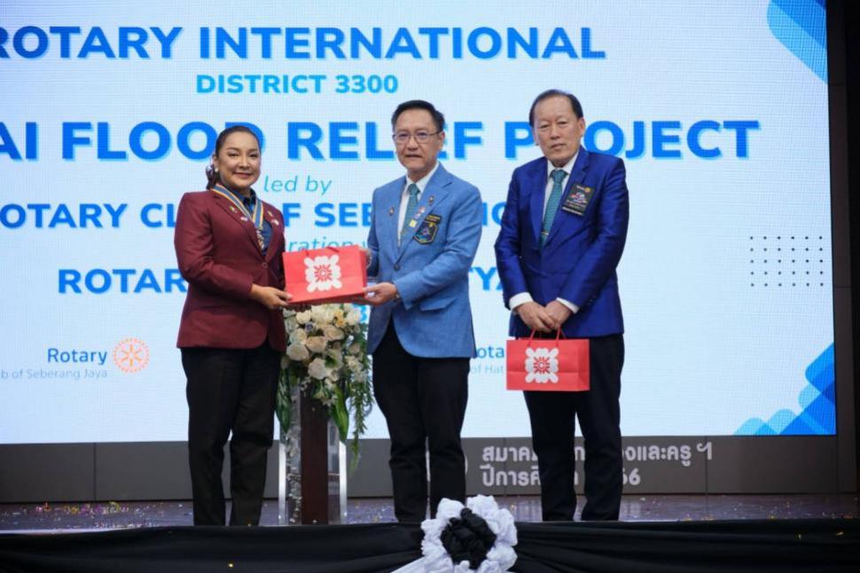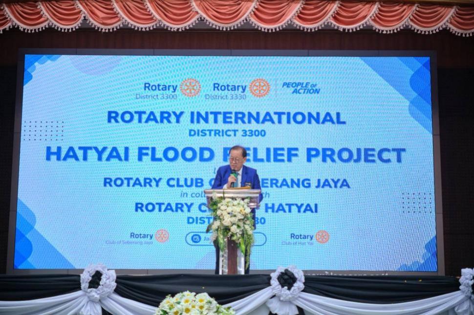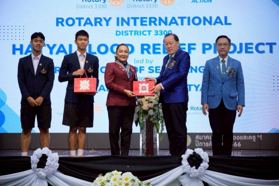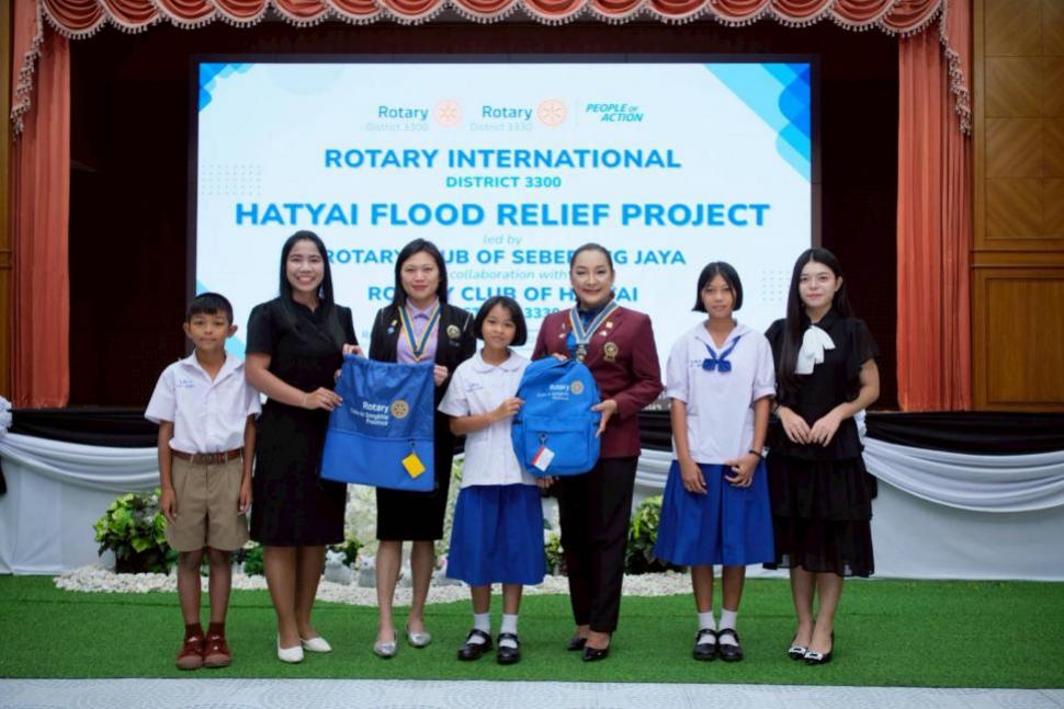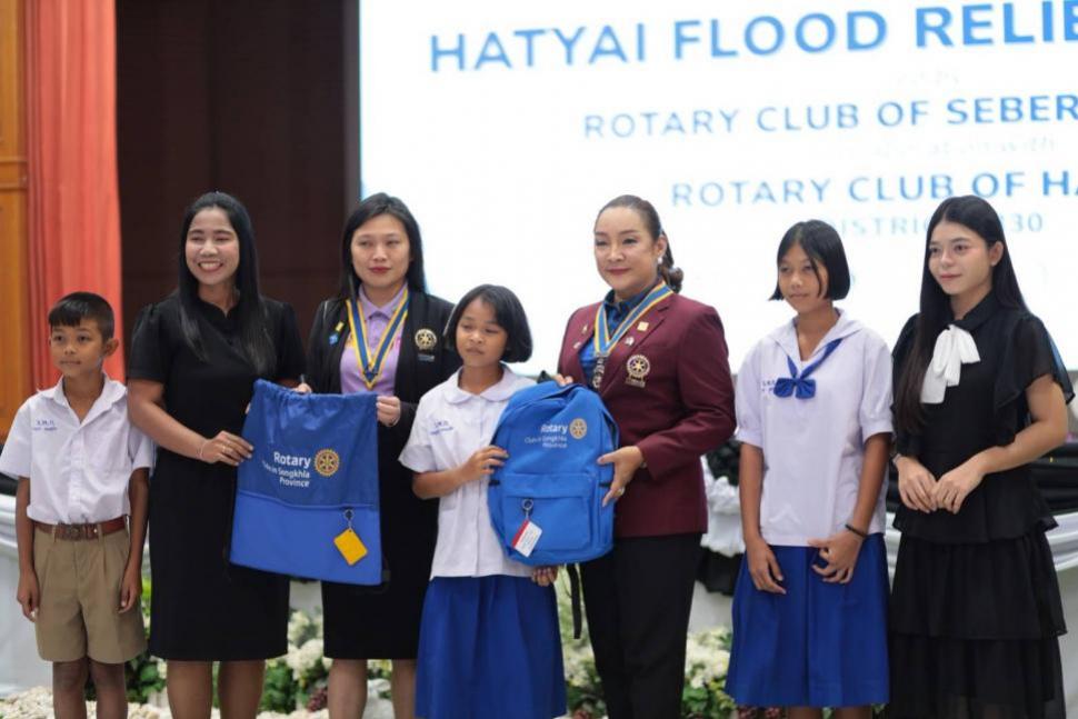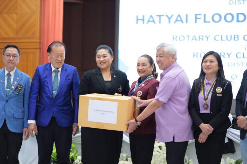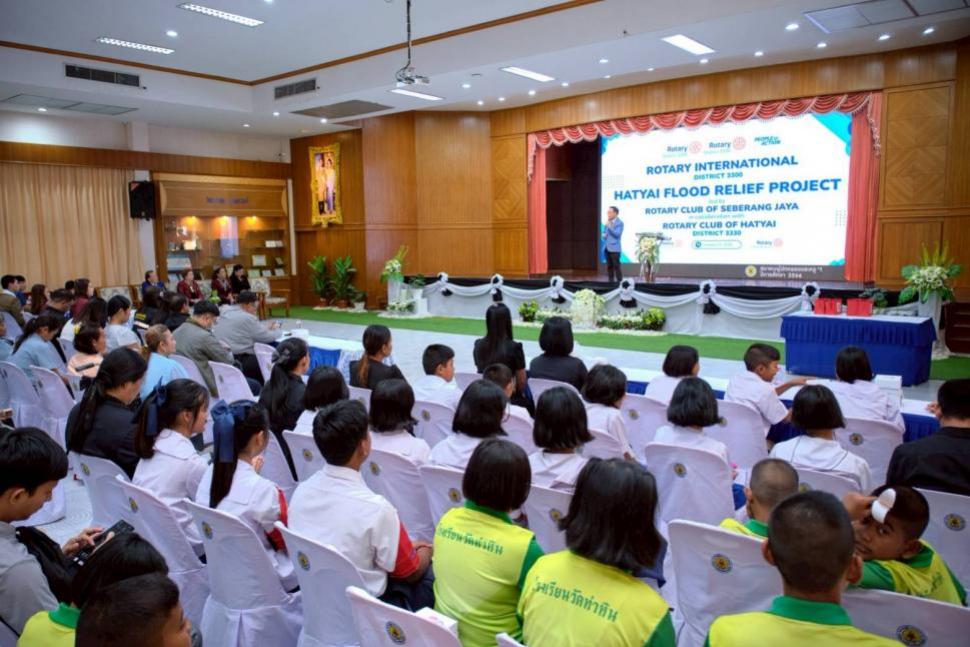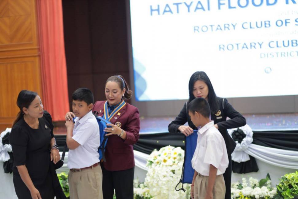 จากสถานการณ์อุทกภัยที่เกิดขึ้นในพื้นที่ อ.หาดใหญ่ จ.สงขลา ส่งผลกระทบต่อการดำรงชีวิตสุขภาพอนามัยและความเป็นอยู่ของนักเรียนและประชาชนในวงกว้าง ทำให้เกิดความจำเป็นเร่งด่วนในการให้ความช่วยเหลือด้านสิ่งของจำเป็นและอุปกรณ์ทางด้านการศึกษาและอุปกรณ์ทางการแพทย์ สโมสรโรตารีหาดใหญ่จึงได้ร่วมมือกับ สโมสรโรตารีในจังหวัดสงขลา ภาค 3330 • สโมสรโรตารีแบงค๊อกแชริตี้ ภาค 3350 • Rotary Club of Seberang Jaya, Rotary Club of Alor Setar Rotary International District 3300, Malaysia • สถานีโทรทัศน์กองทัพบก ช่อง ๕, สถานีโทรทัศน์ NBT ช่อง ๑๑, Songkhla Media, และ Cable 93 • โรงเรียนหาดใหญ่วิทยาลัยสมบูรณ์กุลกันยา/ศูนย์พัฒนาเด็กเล็ก/เทศบาล/โรงพยาบาลส่งเสริมสุขภาพในพื้นที่ อ.หาดใหญ่ จ.สงขลา ร่วมส่งมอบสิ่งของอุปกรณ์ทางด้านการศึกษาและอุปกรณ์ทางการแพทย์ เป็นการรวมพลังแห่งน้ำใจจากเครือข่ายโรตารีทั้งในและต่างประเทศ เพื่อช่วยเหลือ บรรเทาความเดือดร้อน ฟื้นฟูคุณภาพชีวิต และสร้างกำลังใจให้แก่ผู้ประสบอุทกภัยในพื้นที่อำเภอหาดใหญ่ สะท้อนอุดมการณ์การบริการสังคมอย่างยั่งยืนของโรตารีสากลอย่างแท้จริง
