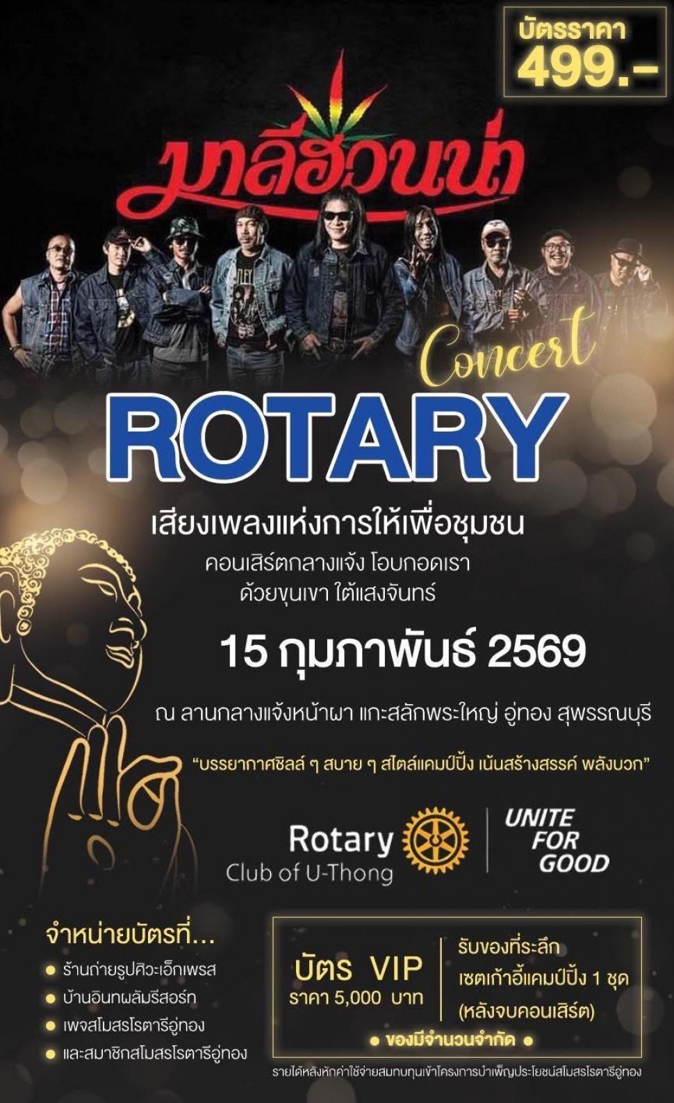 15 กุมภาพันธ์ 2569 สโมสรโรตารีอู่ทอง นำโดย นย.วรัญญา หงษ์ฌวียงจันทร์ พร้อมสมาชิก จัดงาน คอนเสิร์ตมาลีฮวนน่า โอบกอดเราด้วยขุนเขาใต้แสงจันทร์ ณ ลานแกะสลักพระใหญ่ อ.อู่ทอง จ.สุพรรณบุรี เพื่อหารายได้เข้าโครงการบำเพ็ญประโยชน์ของสโมสรโรตารีอู่ทอง