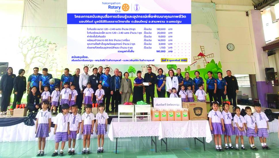 เมื่อวันที่ 9 กุมภาพันธ์ 2569 สโมสรโรตารีนครปฐม นำโดย นย.รัชนี ว่องวิวัฒน์ไวทยะ พร้อมด้วยสมาชิกสโมสรและโรตารีแอนน์ ได้ร่วมกันดำเนินกิจกรรมเพื่อสังคม โดยมอบ สื่อการเรียนรู้และอุปกรณ์เพื่อพัฒนาคุณภาพชีวิต ให้แก่ ศูนย์เด็กเล็ก วิทยาเขตสิรินธรราชวิทยาลัย ในพระราชูปถัมภ์ ตำบลอ้อมใหญ่ อำเภอสามพราน จังหวัดนครปฐม