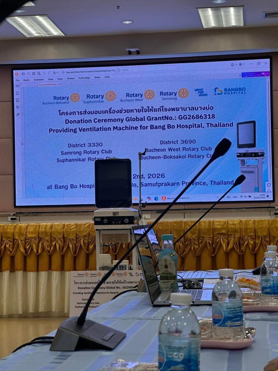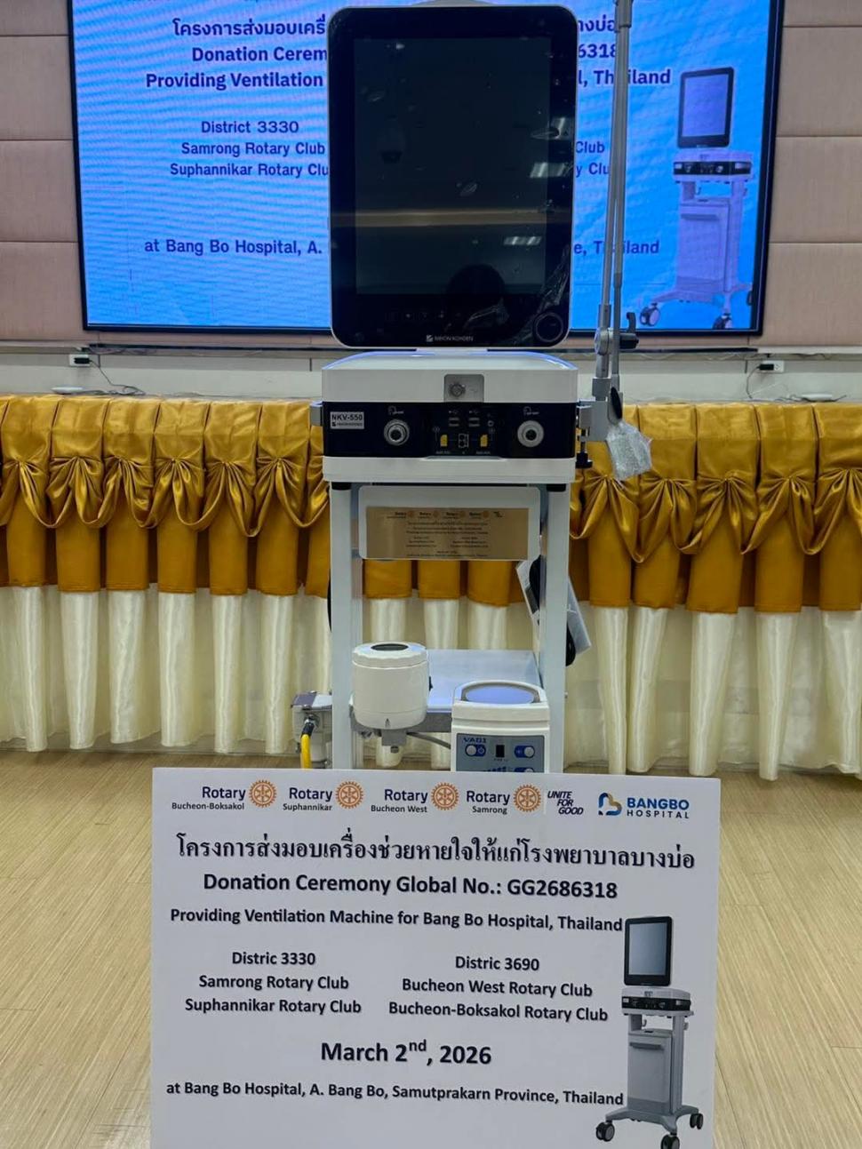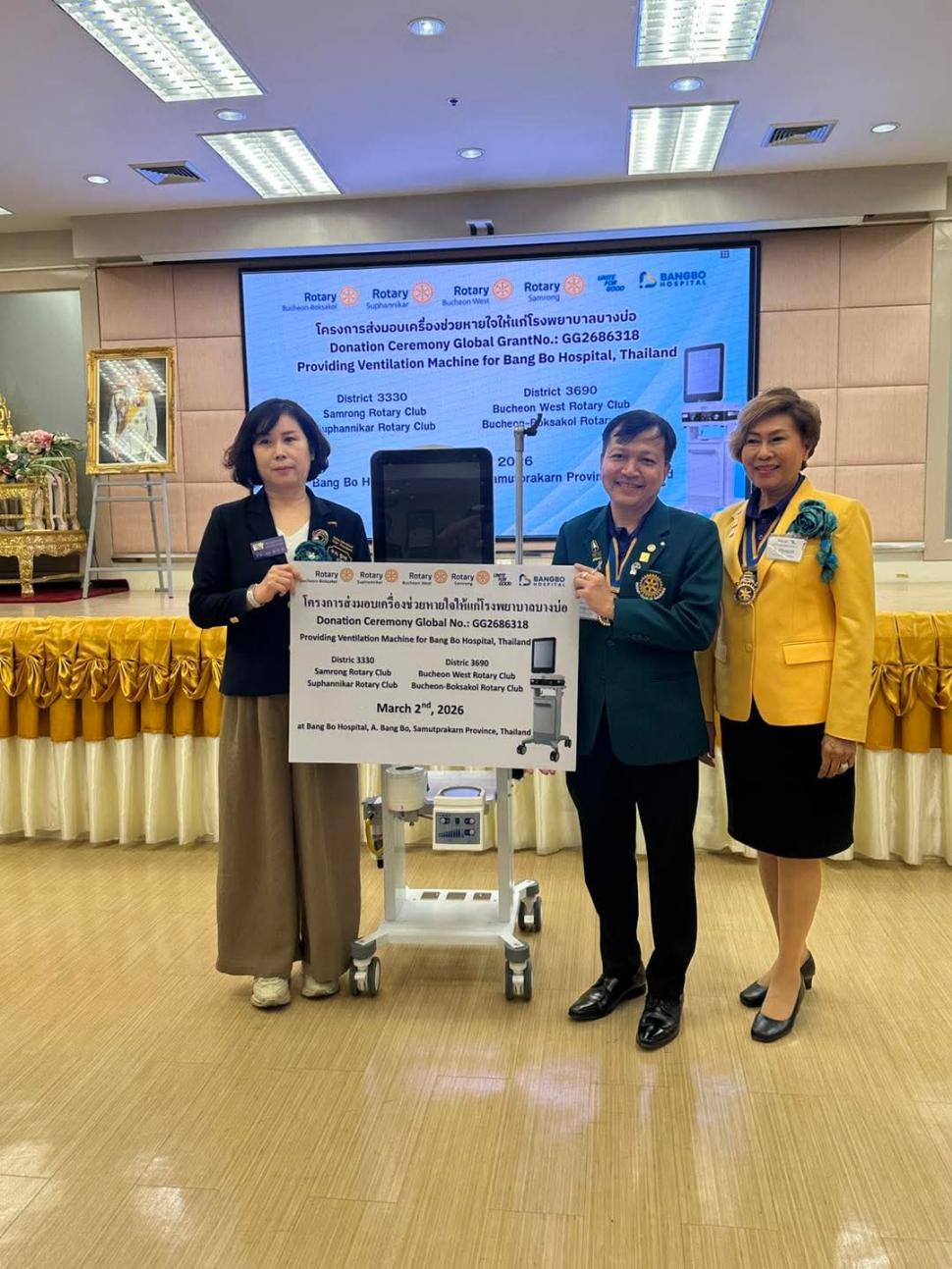 วันที่ 2 มีนาคม 2569 สโมสรโรตารีสุพรรณิการ์ นำโดย นายกปียาพัชร พาเจริญ นยก.ลัดดารัตน์ ตันรัตนวงศ์ พร้อมสมาชิก ร่วมกิจกรรม กับสโมสรโรตารีสำโรง และ Rotary Club of Buchoen West ในโครงการส่งมอบเครื่องช่วยหายใจให้แก่โรงพยาบาล โดยมีคณะผู้บริหารและบุคลากรของโรงพยาบาลร่วมรับมอบ ณ. โรงพยาบาลบางบ่อ อำเภอบางบ่อ จังหวัดสมุทรปราการ