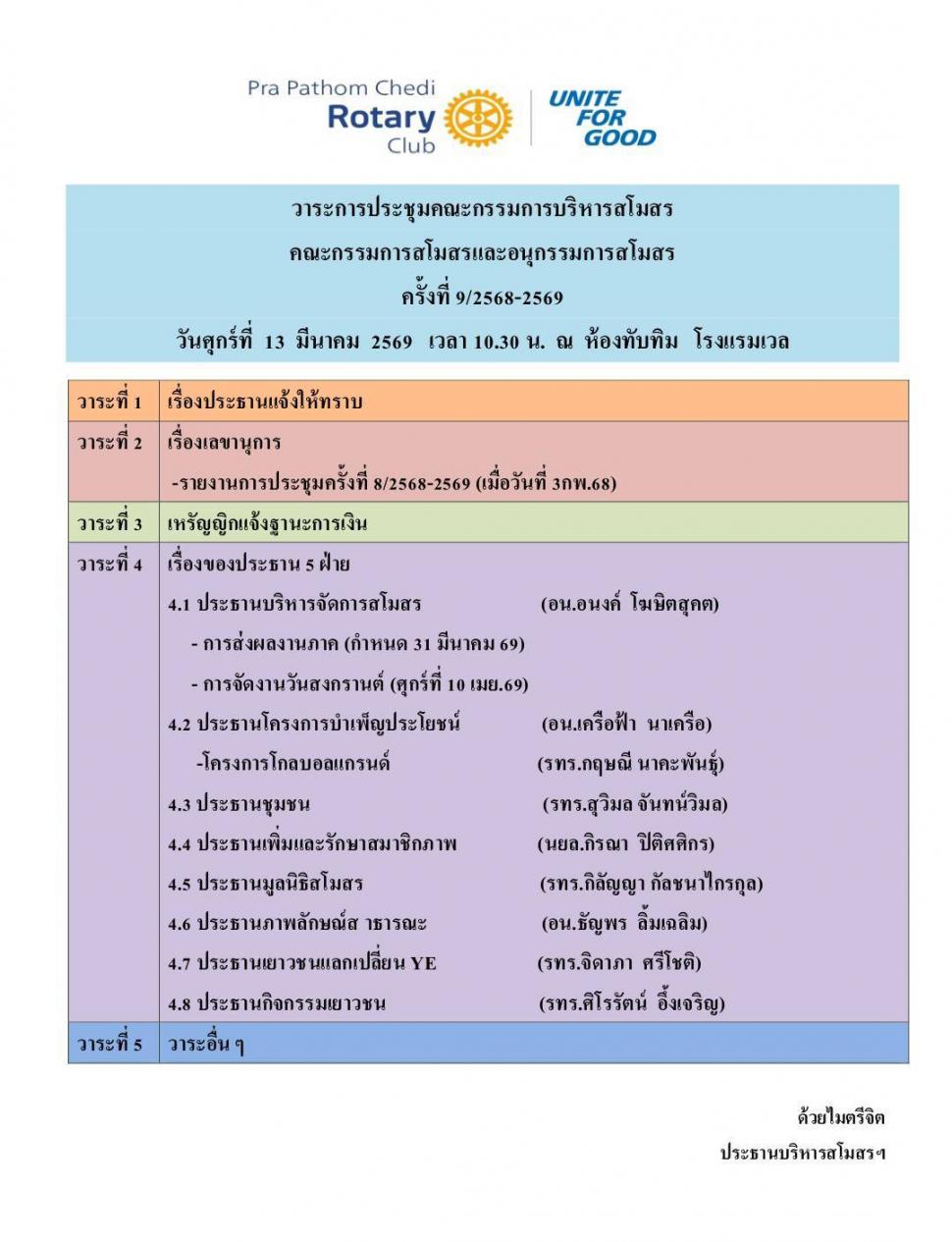 13 มีค.69 สโมสรโรตารีพระปฐมเจดีย์ ประชุมคณะกรรมการบริหารสโมสร,คณะกรรมการสโมสรและอนุกรรมการสโมสร ครั้งที่ 9/2568-2569 เพื่อพิจารณาและสรุปผลกิจกรรมและโครงการต่าง ๆ ทั้ง 5 ฝ่าย เพื่อนำส่งภาคต่อไป ณ ห้องทับทิม โรงแรมเวล