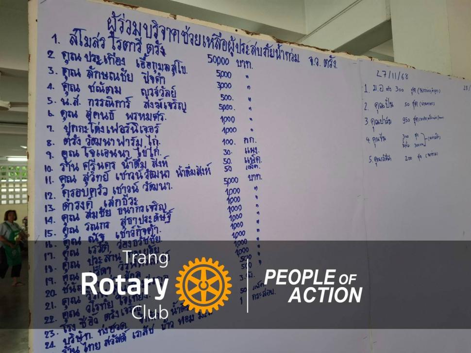 เมื่อวิกฤตน้ำท่วมสร้างความเดือดร้อนเป็นวงกว้างในพื้นที่จังหวัดตรัง สโมสรโรตารีตรัง ภาค 3330 ได้ระดมสรรพกำลังจัดตั้งครัวสนามเร่งด่วน เพื่อช่วยเหลือพี่น้องประชาชนตามอุดมการณ์การบริการเหนือตนเอง