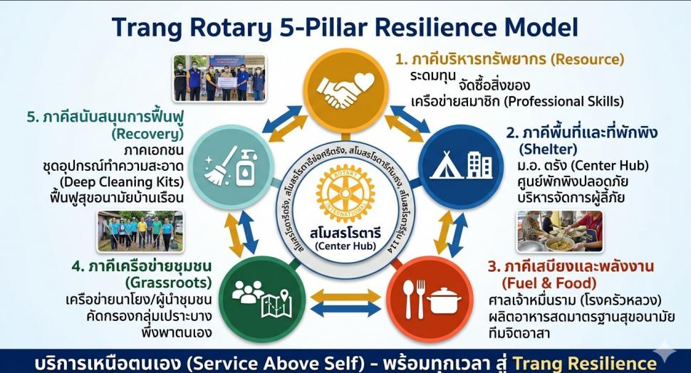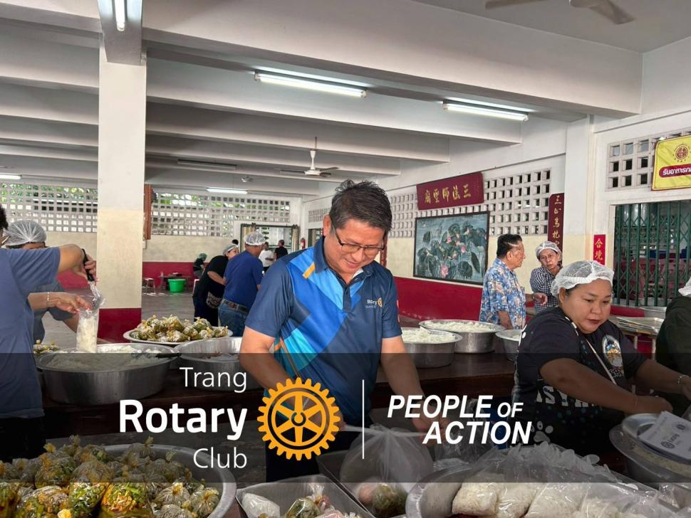 ฝ่ายบำเพ็ญประโยชน์ สโมสรโรตารีตรัง,สโมสรโรตารีช่อศรีตรัง, สโมสรโรตารีทับเที่ยง, กลุ่มนายกรุ่น 114 ภาค3330และภาคเอกชน สโมสรโรตารีตรังได้บูรณาการความร่วมมือกับภาคีเครือข่าย จัดทำโครงการบรรเทาสาธารณภัยโดยมีจุดดำเนินการหลัก ณ ศาลเจ้าหมื่นราม (ครัวกลาง) เพื่อสนับสนุนภารกิจดังนี้:
