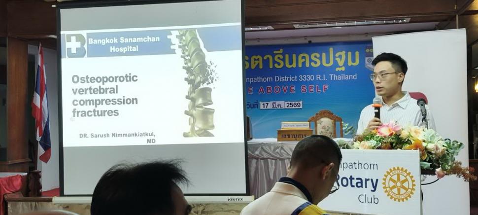 สโมสรโรตารีนครปฐมจัดการประชุมสัปดาห์ ครั้งที่ 33 ปี 2568-2569 โดยการนำ นย.รัชนี ว่องวิวัฒน์ไวทยะ ณ ห้องทับทิม โรงแรมเวล โดยมีการอวยพรคล้ายวันเกิดให้กับสมาชิก และเชิญวิทยากรจากโรงพยาบาลกรุงเทพสนามจันทร์ มาพูดคุยกับเรื่องกระดูกพรุน และการหกล้มภัยเงียบที่ป้องกันได้ โดย นพ.สารัช นิมมานเกียรติกุล วันที่ 17 มีนาคม 2569