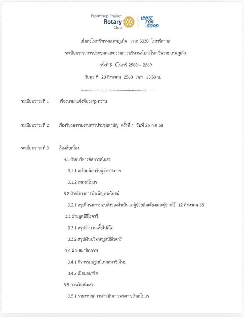 การประชุมคณะกรรมการปีโรตารี 2568-2569 ครั้งที่5 วันที่ 20 ส.ค 2569 เวลา 18.30 น.