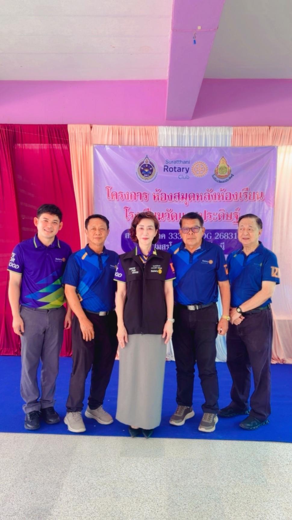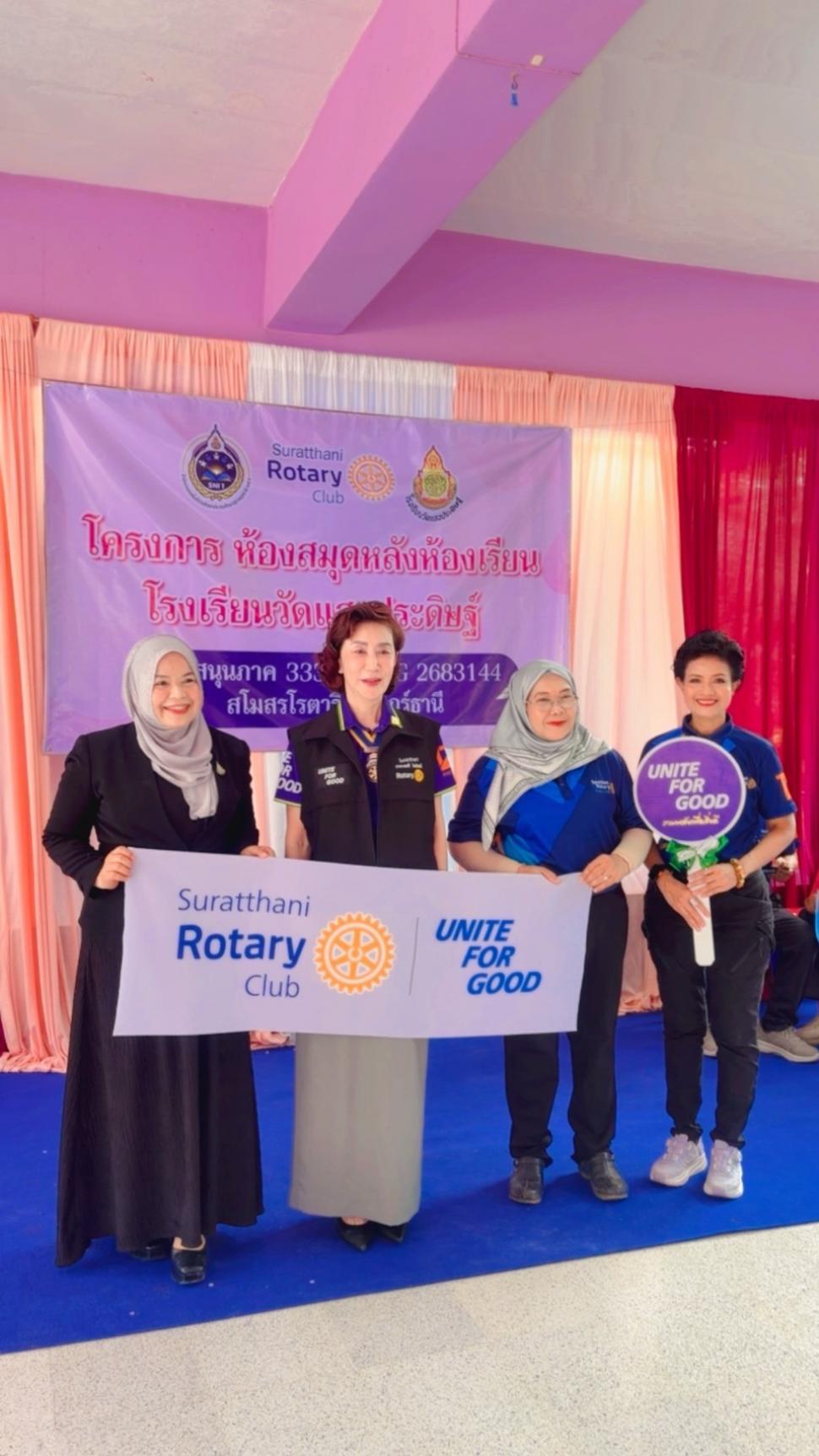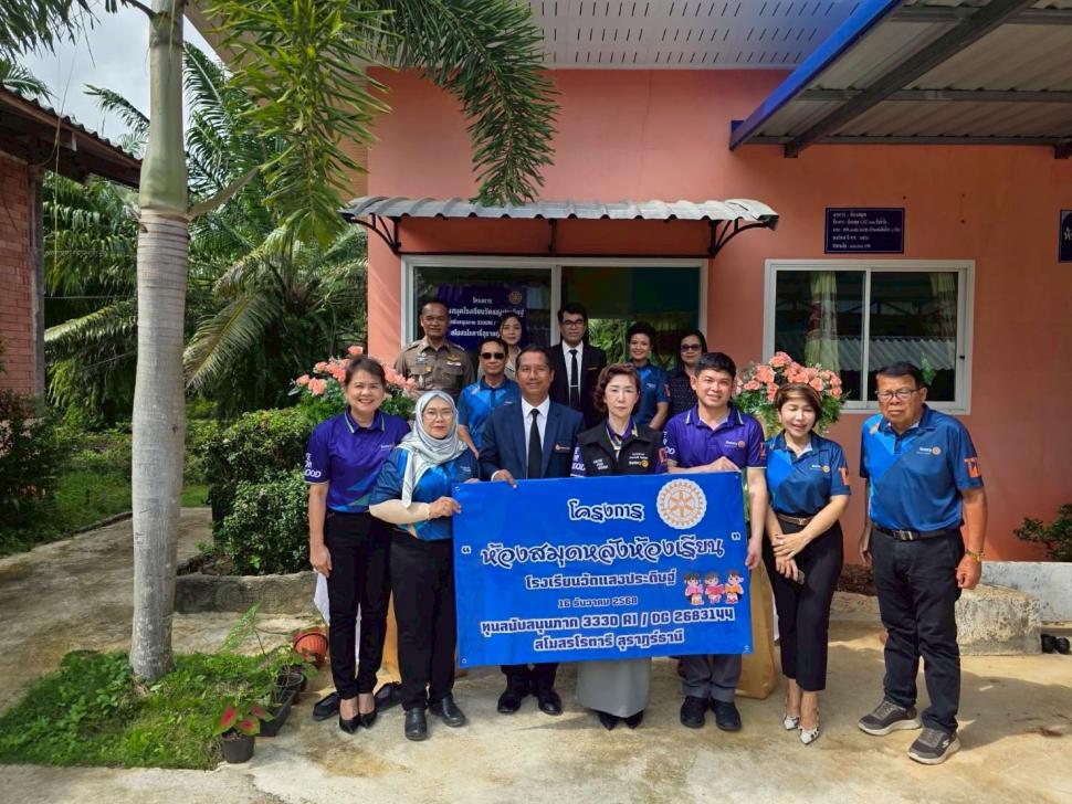 มีพิธีมอบโครงการ “ห้องสมุดหลังห้องเรียน” ให้แก่ โรงเรียนวัดแสงประดิษฐ์ ตำบลตะเคียนทอง อำเภอกาญจนดิษฐ์ จังหวัดสุราษฎร์ธานี ในวันที่ 16 ธันวาคม 2568 นำโดย นายกพรศรี นิลวัชรมณี นายกสโมสร นายกรับเลือกสุมิตรา ทองเฝือ ประธานฝ่ายบำเพ็ญประโยชน์ และโรแทเรียลสโมสรโรตารีสุราษฎร์ธานี เป็นฝ่ายส่งมอบโครงการ โดยมีนายรัฐพงษ์ พงศาปาน ผู้อำนวยการโรงเรียน คณะครู นักเรียน และบุคลากร โรงเรียนวัดแสงประดิษฐ์ เป็นฝ่ายรับมอบโครงการ