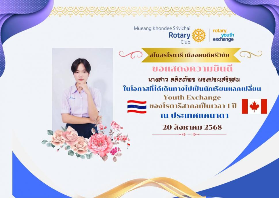 สโมสรโรตารีเมืองคนดีศรีวิชัย นำโดยคณะกรรมการบริหารและมวลมิตรโรตารียน มีความภาคภูมิใจและขอแสดงความยินดีเป็นอย่างยิ่งแก่ นางสาวลลิตภัทร พรประเสริฐสม ในโอกาสที่ได้รับคัดเลือกเป็นตัวแทนเยาวชนเข้าร่วม โครงการเยาวชนแลกเปลี่ยนโรตารีสากล (Rotary Youth Exchange) เพื่อเดินทางไปศึกษาวัฒนธรรมและแลกเปลี่ยนประสบการณ์ ณ ประเทศแคนาดา เป็นระยะเวลา 1 ปี โดยมีกำหนดการออกเดินทางในวันที่ 20 สิงหาคม พ.ศ. 2568 นี้