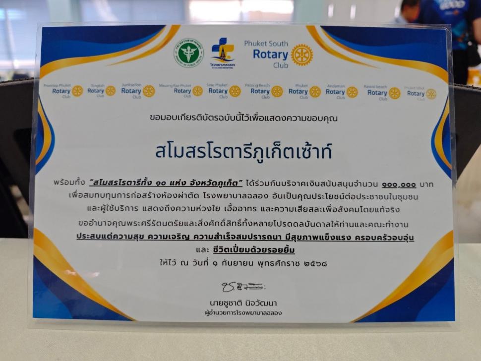 วันที่ 1 กันยายน พ.ศ. 2568 สโมสรโรตารีภูเก็ตเซ้าท์ ร่วมกับ 10 สโมสรโรตารีในจังหวัดภูเก็ต