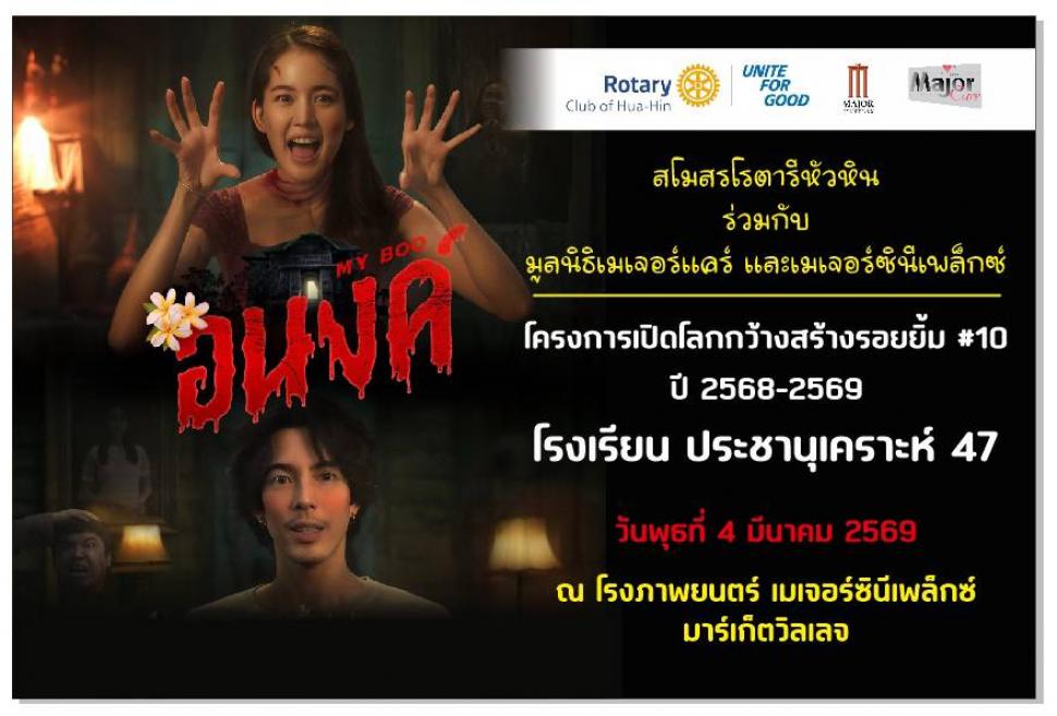 วันที่4มีนาคม 2569 กิจกรรมพาน้องดูหนัง ปีที่10 สโมสรโรตารีหัวหินร่วมกับ โรงหนังเมเจอร์ ศูนย์การค้ามาร์เก็ตวิลเลจ หัวหิน และมูลนิธิเมเจอร์แคร์ นำนักเรียนจากโรงเรียนราชประชานุเคราะห์ 47 ชั้น ม.3 และม.4 เข้าชมภาพยนตร์ เรื่องอนงค์ 2 เพื่อให้เกิดความเพลิดเพลิน สนุกสนาน ทำให้จิตแจ่มใสช่วยพัฒนาทักษะการเรียนรู้ และสุขภาพจิตดี ในครั้งนี้มีจำนวนนักเรียน 160คนและคุณครูดูแลพร้อมผู้อำนวยการ จำนวน12ท่าน เวลา09.00 นายกสโมสรกล่าววัตถุประสงค์ เวลา09.30 แจกอาหารว่างพร้อมถ่ายรูปร่วมกัน เวลา 10.00 เข้าโรงภาพยนตร์ เวลา10.30 ร้องเพลงชาติ หนังเริ่มฉาย เวลา 12.30 หลังเลิกเดินแถวไปขึ้นรถกลับโรงเรียน