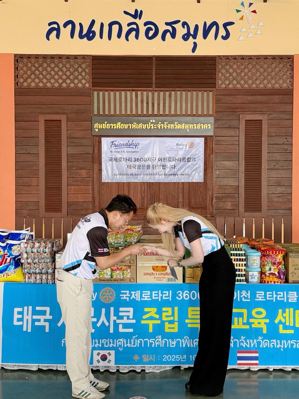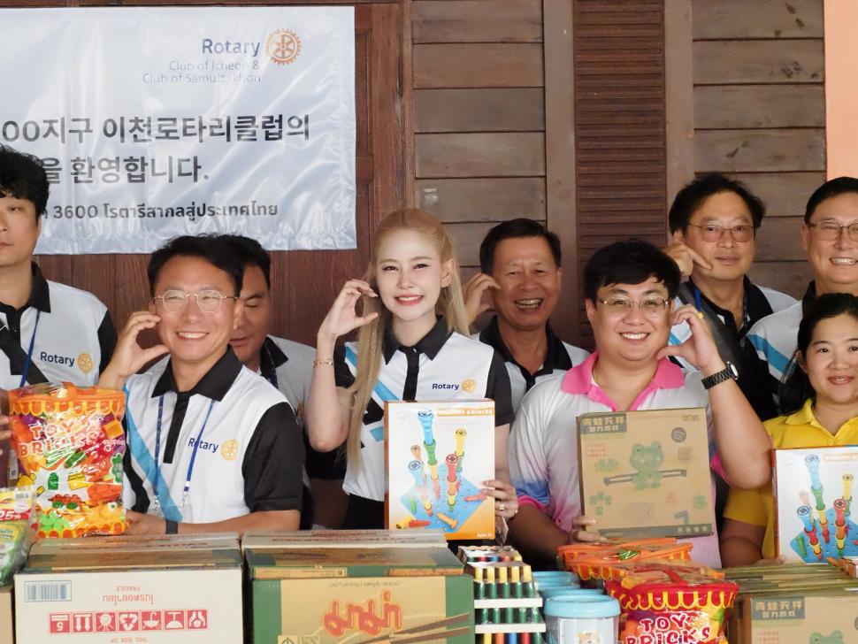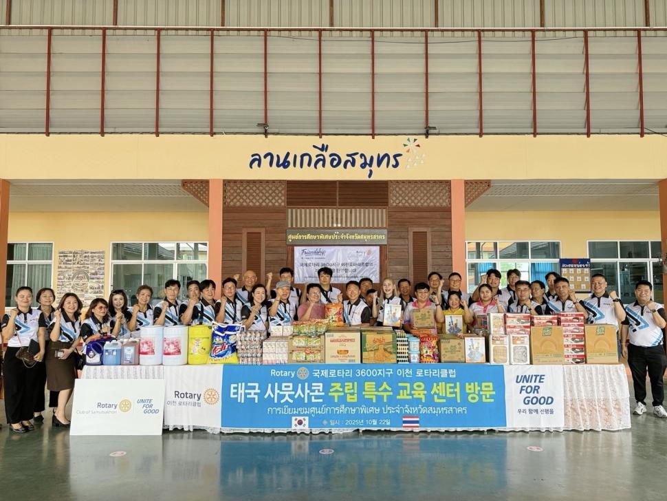 วันที่ 22 ตุลาคม 2568 นำโดย นายกสุภาภรณ์ พัวพันธ์ พร้อมด้วยสมาชิก เลี้ยงอาหารและมอบเครื่องอุปโภคบริโภคให้กับเด็กพิเศษ ร่วมกับสโมสรโรตารีอิชอน(ประเทศเกาหลีใต้ ) ณ ศูนย์การศึกษาพิเศษประจำสมุทรสาคร