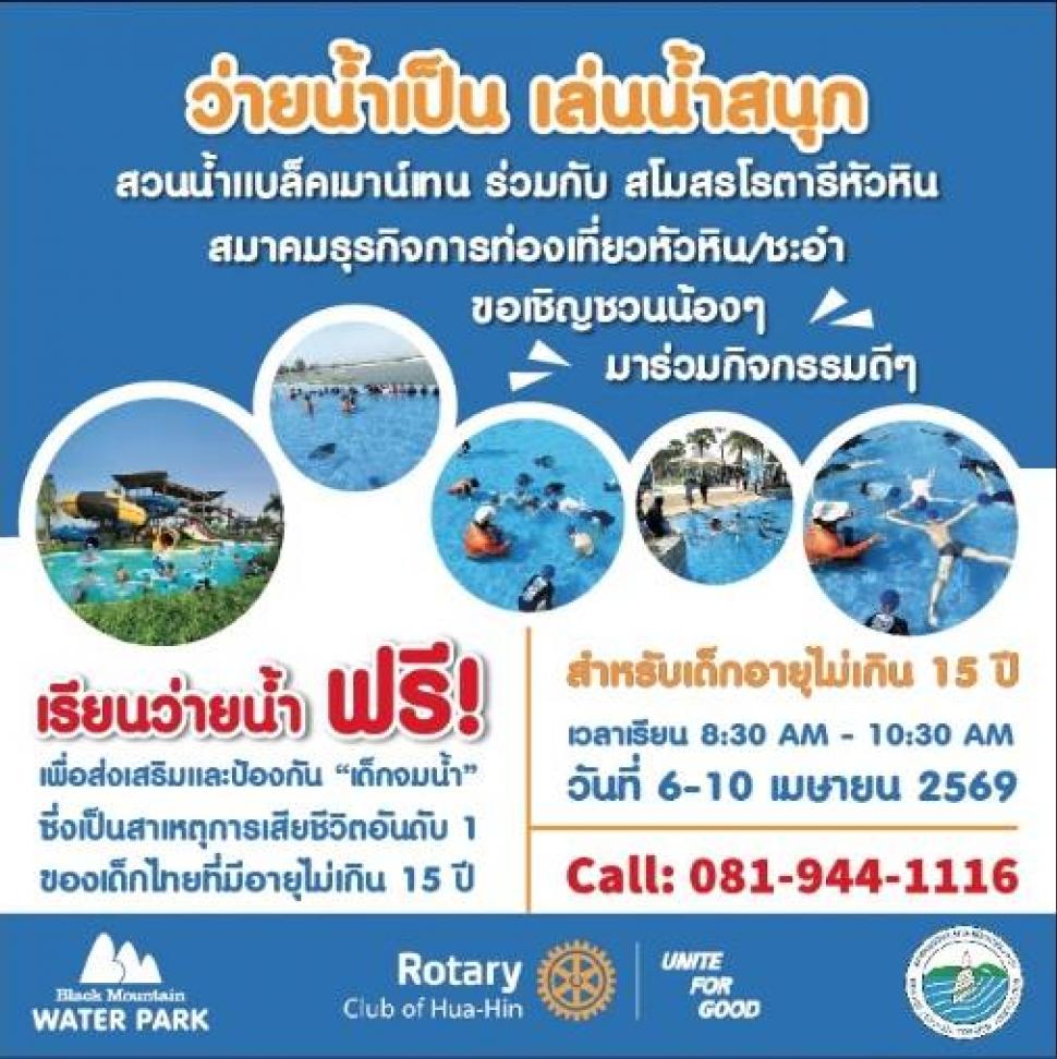สโมสรโรตารี่หัวหิน สมาคมการท่องเที่ยวฯหัวหิน-ชะอำ ร่วมกับ สวนน้ำแบคเมาเท่น จัดกิจกรรมช่วงปิดเทอมสอนให้เด็กๆเรียนรู้การว่ายน้ำช่วยเหลือตัวเองและผู้อื่นเมื่อจมน้ำ รู้จักการป้องกันตัวเองและรู้วิธีเมื่อเกิดการจมน้ำ ตั้งแต่ วันที่ 6 -10เมษายน 2569 ณ สวนน้ำแบคเมาเท่น อายุตั้งแต่7-15ปี ฟรีไม่มีค่าใช้จ่าย