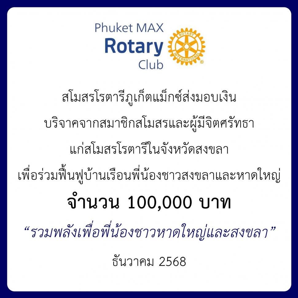 Phuket MAX RC สนับสนุนเงิน 100,000 B ให้กับสโมสรโรตารีในจังหวัดเพื่อช่วยฟื้นฟู อ หาดใหญ่ หลังอุทกภัยครั้งใหญ่