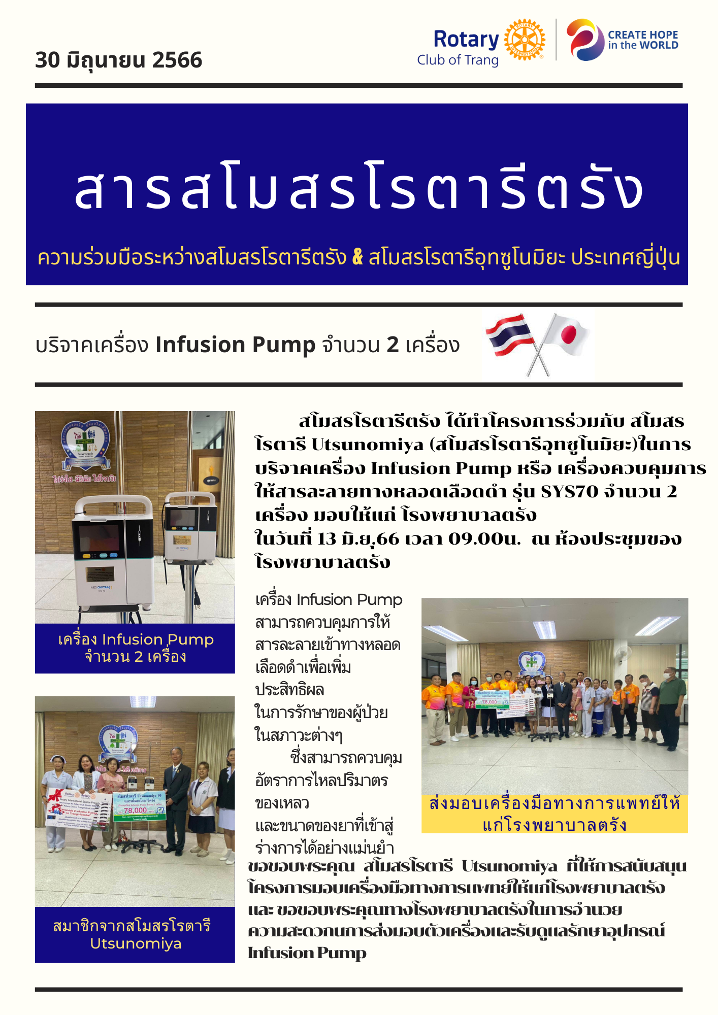 โครงการบริจาคเครื่องมือทางการแพทย์ ร่วมกับสโมสรอุทซูโนมิยะ ประเทศญี่ปุ่น